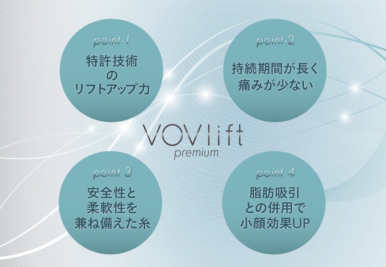 VOVリフトは、これまでのスレッドリフトとは素材の異なる糸「VOVリフト・プレミアム」を用いたフェイスリフトです。糸の素材や形状の進化によって、従来より安全かつ長期的なリフトアップ効果が期待できます。