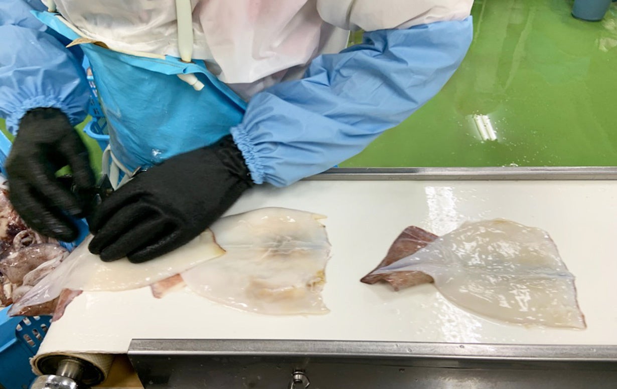 北海道産のスルメイカは、年々漁獲量が減少しており、約10年間で10分の1程度まで減ってきています。漁獲量減少に伴い、価格の高騰化も進み、今では大変希少な食材となっております。今回はその希少なスルメイカでも、特に柔らかな“胴身のみ”を原料に選び、贅沢に使用しました。