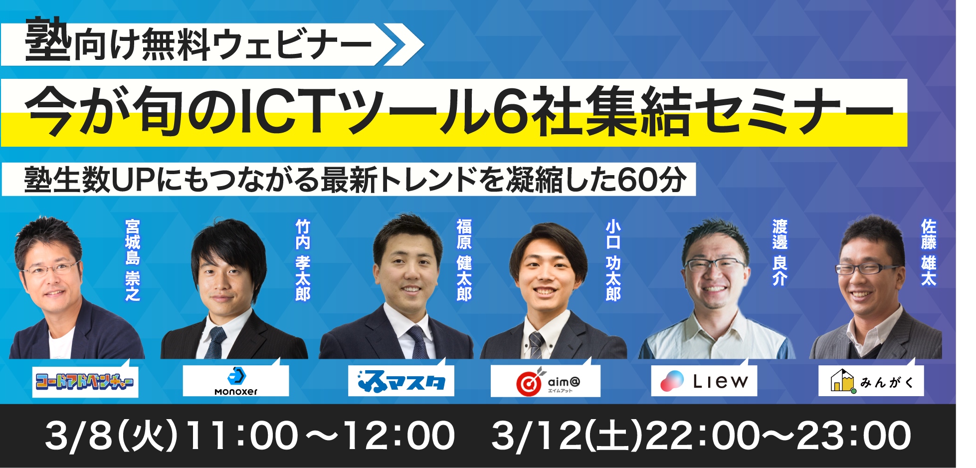 急成長EdTech6社(株式会社グランシップ・合同会社ドリーマーズギルド・株式会社みんがく・株式会社メイツ・モノグサ株式会社・株式会社Lacicu ※五十音順)による共催にて、「今が旬のICTツール6社集結セミナー」の開催が決定致しました。開催は、以下の2日程(日時①:2022年3月8日(火)11:00〜12:00、日時②:2022年3月12日(土)22:00〜23:00)で行い、いずれもWebセミナーでの実施となります。また本セミナーは、各社7分のプレゼン+2分の質疑応答というピッチ形式で進行するため、白熱したプレゼンバトルとなることが予想されています。