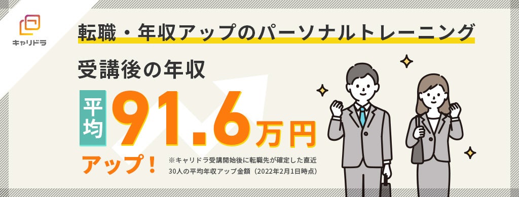 去年7月に正式リリースした日本初の年収アップのパーソナルトレーニング「キャリドラ」が、1月でリリースから半年を迎えました。約1万人の方にカウンセリングをお申し込みいただき、受講開始後に転職先が確定した方の年収が平均で91.6万円アップしていたことがわかりました。