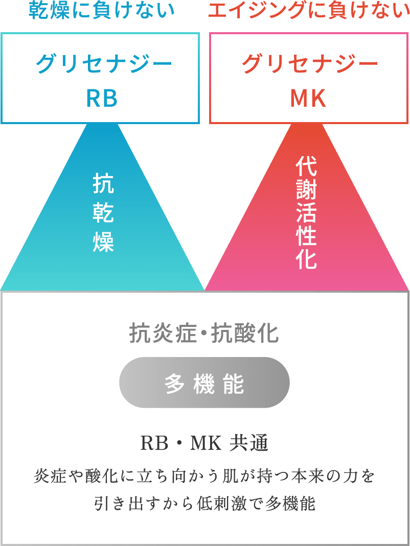 これまでの皮膚疾患の治療薬開発過程で見出された3つの効果に、美容成分としての新しい機能が次々と解明され、肌トラブルケアからエイジングサインの解決まで、多機能に効果を発揮できる成分として新たに2つの「グリセナジー™」が誕生しました。