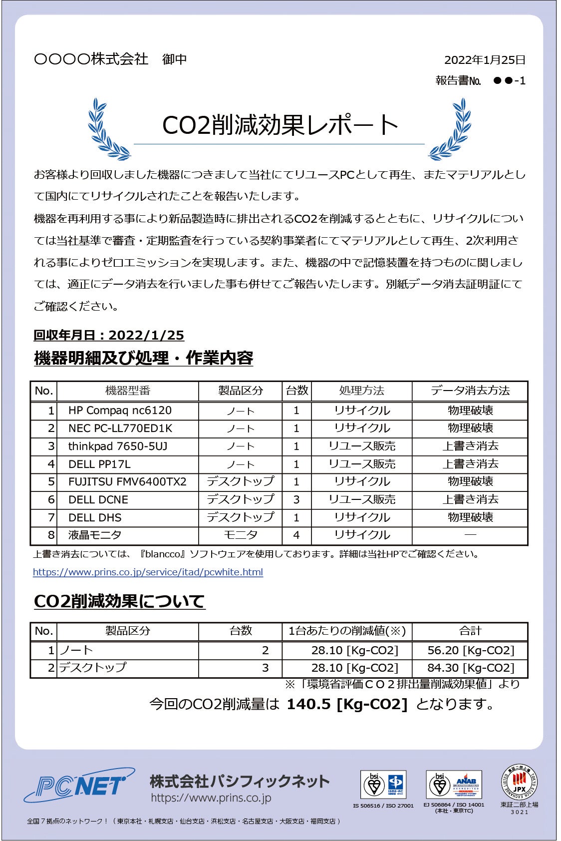 株式会社パシフィックネット(本社:東京都港区、代表取締役社長:上田 満弘、以下 当社)は、企業の脱炭素への取組みを支援するため、「CO2削減効果レポート」サービス(以下 本サービス)を開始いたします。本サービスは、従来のデータ消去サービスである「PCホワイト(※1)」の無償オプションサービスとして提供いたします。