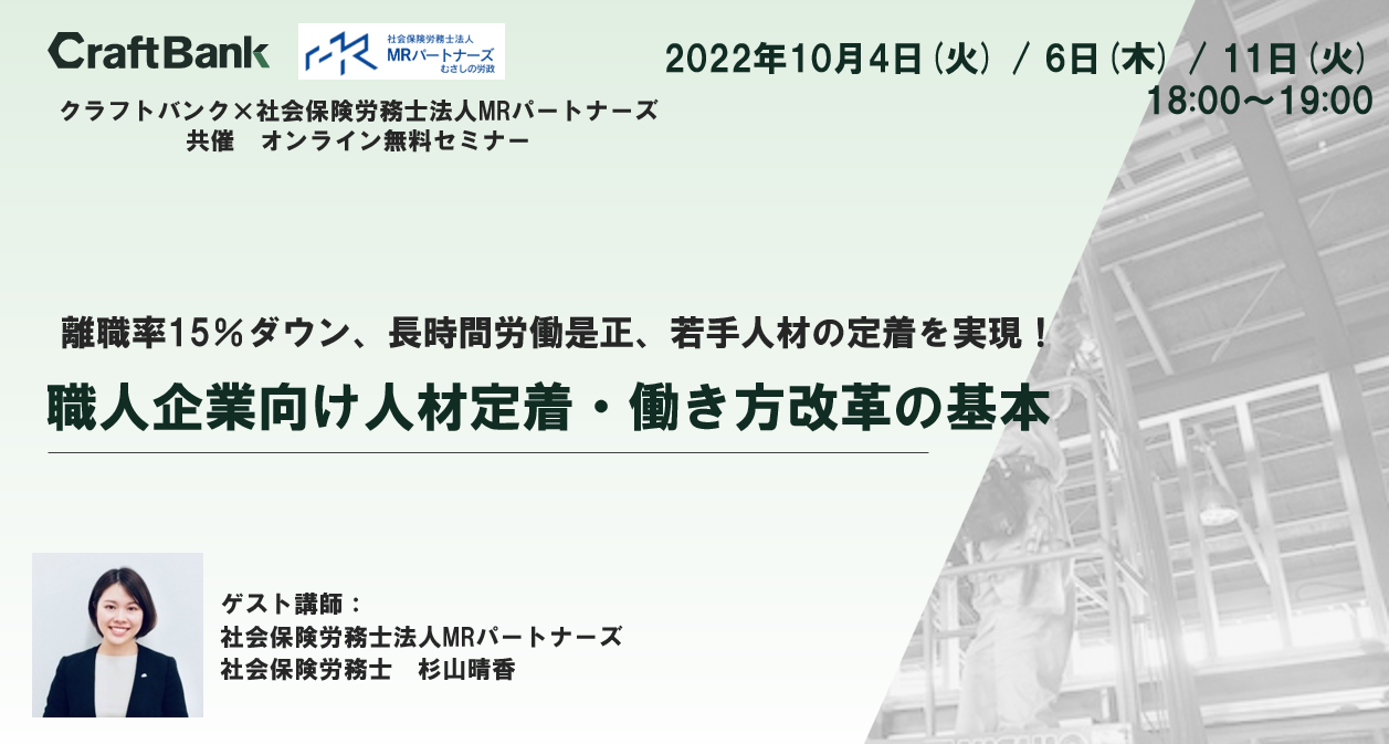 建設DXのスタートアップ・クラフトバンク株式会社は、10月4日、6日、11日の3日程で無料オンラインセミナー「職人企業向け人材定着・働き方改革の基本」を開催します。本セミナーでは中小建設会社向けに2024年からの時間外労働の上限規制対策(2024年問題)の対策や、採用力の強化、離職率改善に関して実例に即して解説します。