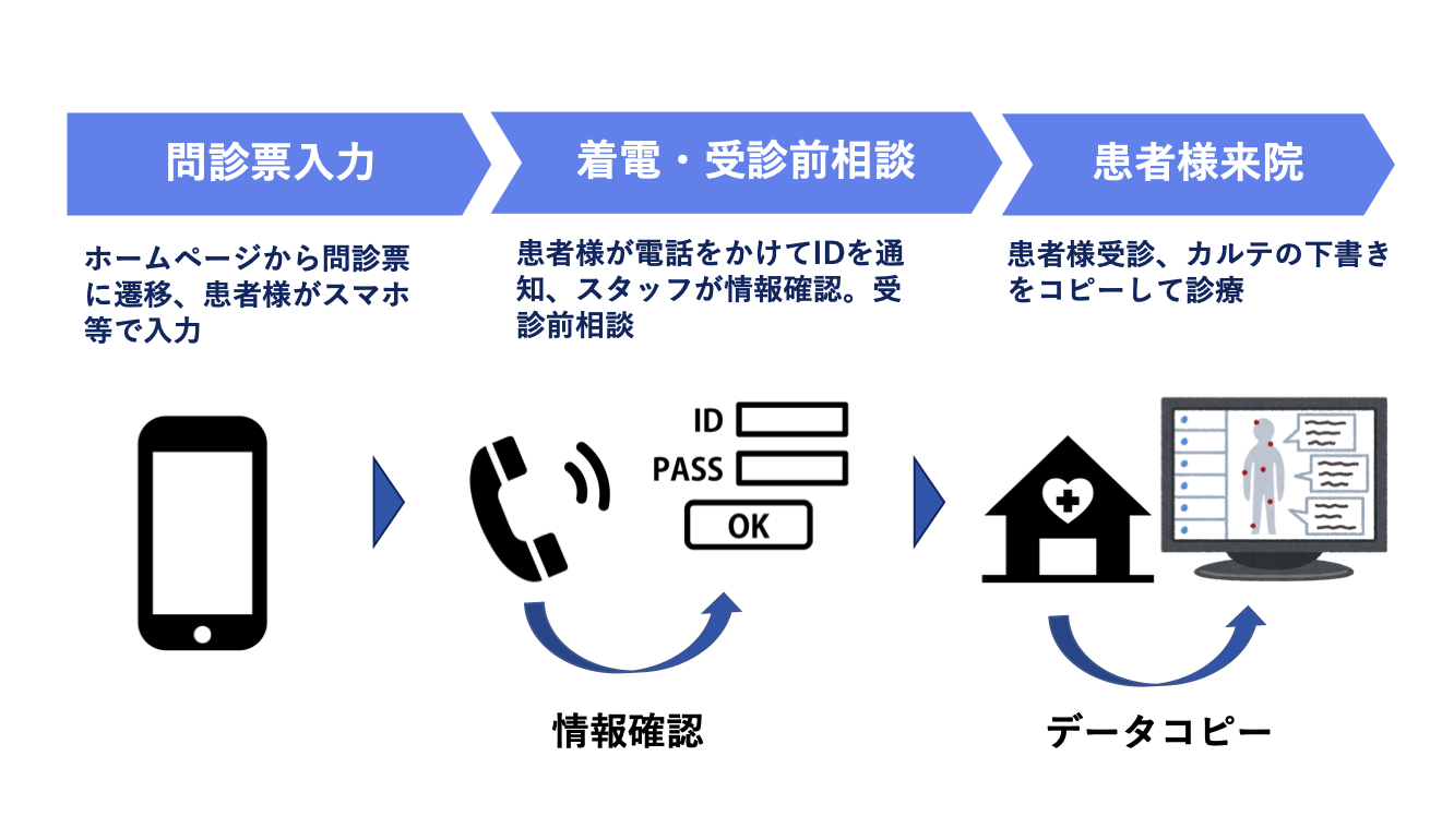 来院前にご自宅や駐車場等から、患者のスマートフォンで問診に回答し、事前に問診結果からカルテ下書きを自動作成することのできる仕組みです。