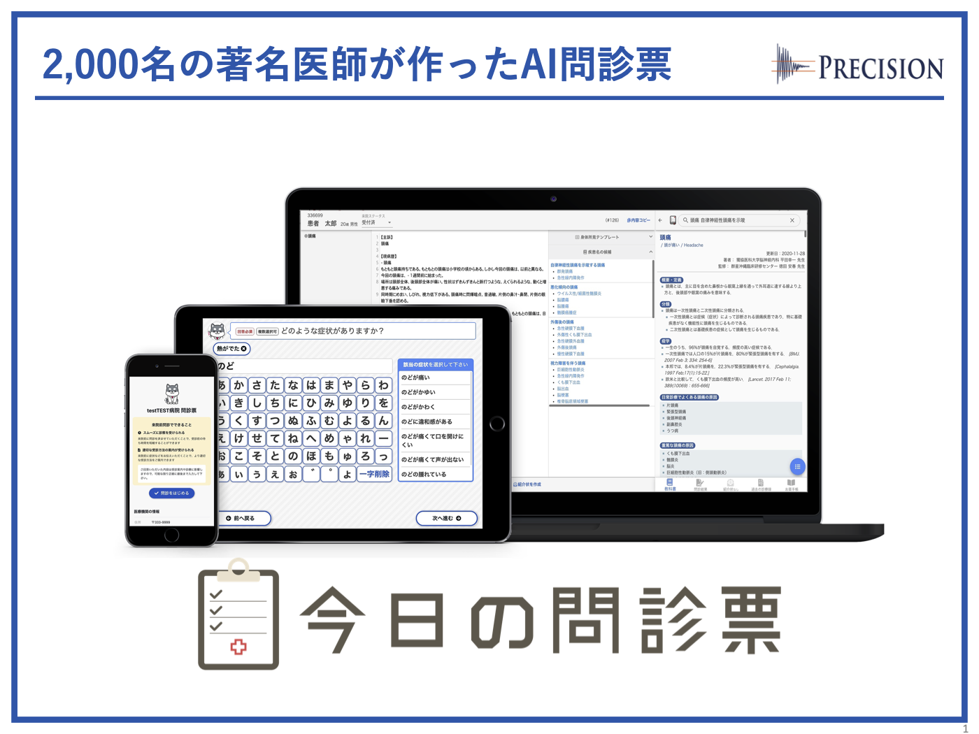 株式会社プレシジョン(本社:東京都文京区、代表:佐藤 寿彦〈医師、AI研究者〉、以下「プレシジョン」)は、新型コロナウイルス第6波の感染拡大および医療提供体制の逼迫にともなう社会的な要請の高まりを受け、院内の感染防止や混雑緩和に役立つAI診療支援「今日の問診票」をクリニック・診療所向けに1月28日から2月末日まで無償提供します。