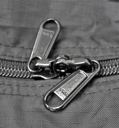 表面裏面のダブルサイドに丈夫なYKKファスナーを採用。メインファスナーは小型南京錠取り付け用のホール付き。別途カギを用意すれば、貴重品を運ぶときにも便利です。