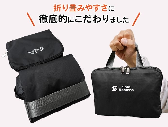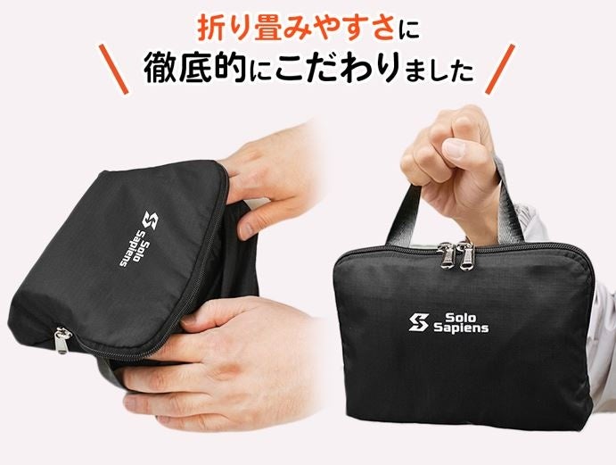 世界一周したバックパッカーである創業者の経験をもとに、快適でスマートな旅を実現するための機能や品質を追求した旅行アイテムを展開する、ソロサピエンス。新商品のCheesaQ〈チーサック〉は、小さく折りたためる携帯用の超軽量ボストンバッグです。旅先での散策時や、お土産などの荷物が増えてしまったときに、サッと取り出しサッと使える究極の使い勝手を目指して誕生しました。容量は、国内線の機内持ち込みが可能な30L。たためば手のひら大のコンパクトサイズで、重さはわずか270g。手持ち、肩掛け、キャリーケース固定の3ウェイに対応するなど、旅先でのニーズをあらゆる面から追求した究極のサブバッグです。