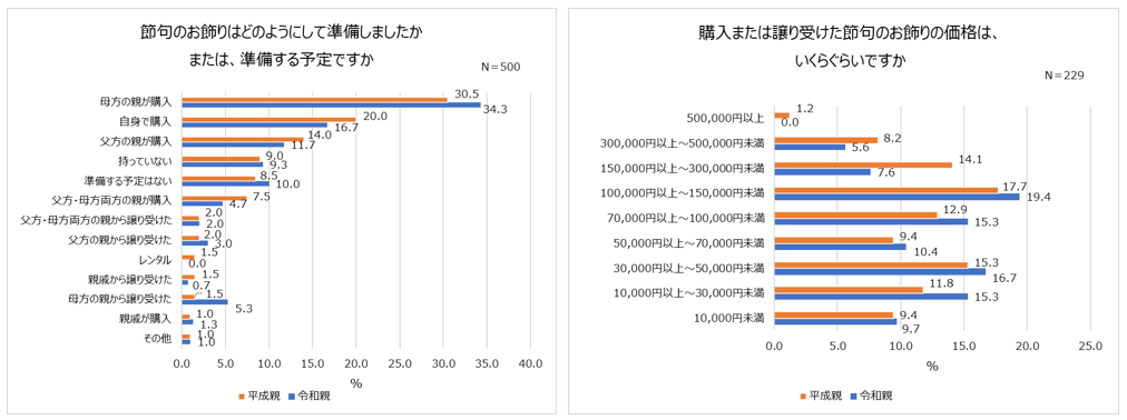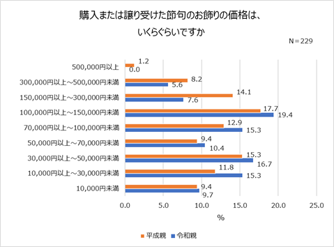 次に、購入または譲り受けた節句のお飾りの価格について聞いたところ、両世代とも「100,000円以上~150,000円未満(平成親17.7%・令和親19.4%)」が最も多い一方で、「30,000円以上~50,000円未満(平成親15.3%・令和親16.7%)」が次に多い結果となり、1位と2位の価格帯に差があることが明らかになりました。また、令和親は150,000円以上の比較的高価格帯のものを持つ人が1割程度なのに対し、平成親は2割以上もいることが分かりました。