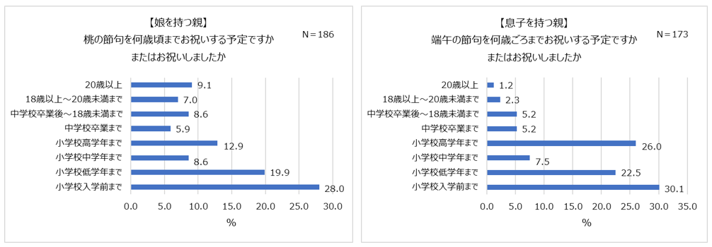 続いて、節句は何歳頃までお祝いしたか、またはお祝いする予定かを尋ねると、「桃の節句」では「小学校入学前まで(28.0%)」に最も多くの票が集まりました。また、約1割が「20歳以上(9.1%)」でもお祝いしていることが分かりました。「端午の節句」では、同様に「小学校入学前まで(30.1%)」が多いものの、「20歳以上(1.2%)」の回答はあまり見られず、「小学校高学年まで(26.0%)」や「小学校低学年まで(22.5%)」が多い傾向にあることが分かりました。「桃の節句」では、「端午の節句」に比べて年齢が上がってもお祝いする家庭が多い一方で、「端午の節句」では小学校高学年までをボーダーラインとする家庭が多いようです。