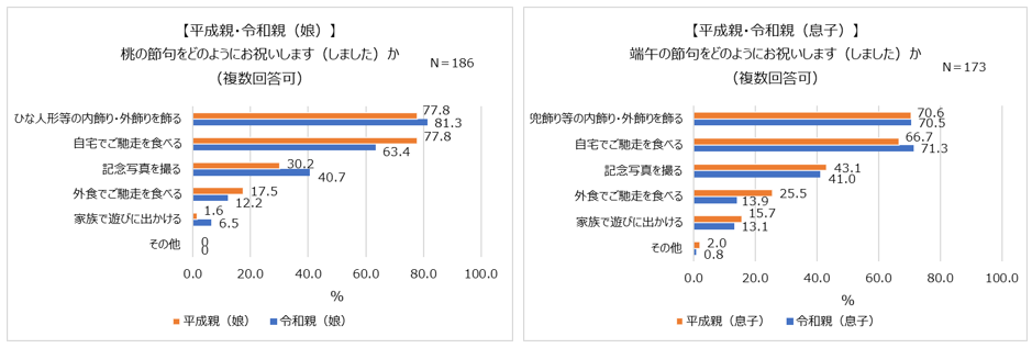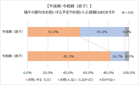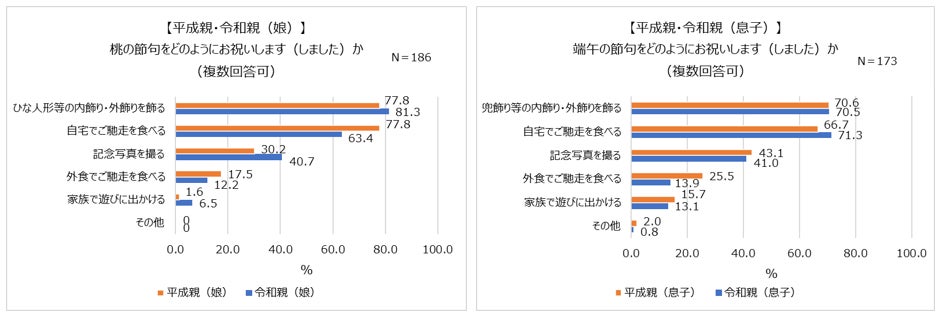 続いて、認知度が9割を超えていた「七夕の節句」、「桃の節句」、「端午の節句」に焦点を当て、内飾りを飾ったり、ご馳走を食べたりと、節句をお祝いする予定やお祝いした経験について、平成親と令和親で比較しました。その結果、「桃の節句」では、「お祝いする(した)」人は、女の子の子どもを持つ平成親が63.0%であるのに対し、令和親は82.0%と、19.0%もの差があることが判明。「端午の節句」でも、「お祝いする(した)」と回答したのは、男の子の子どもを持つ平成親が51.0%、令和親が81.3%と、令和親の方が「桃の節句」、「端午の節句」のお祝いに積極的であることが見て取れました。「子どもの成長を願う行事」という点において、「桃の節句」、「端午の節句」は、親にとって重要な行事であると言えそうです。