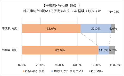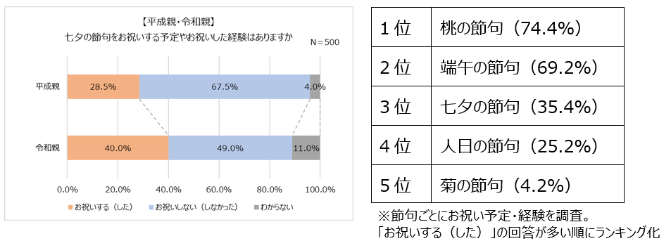 一方で、最も認知度の高かった「七夕」は、平成親・令和親ともに、「お祝いしない(平成親67.5%・令和親49.0%)」が「わからない」を除き、多数派であることが分かりました。
