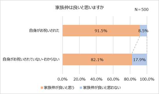 最後に、自身が節句のお祝いをされた経験があるかという質問に対して、家族仲で結果を比較しました。すると、自身がお祝いされていない・わからないと回答した人のうち、「家族仲が良いと思う」と答えた人は、82.1%だったのに対し、自身がお祝いされたと回答した人は91.5%という結果になりました。お祝いされた経験のある人の方が、家族仲が良いと思う割合が高いことが分かりました。節句のお祝いは、家族のつながりを深める良い機会とも言えそうです。