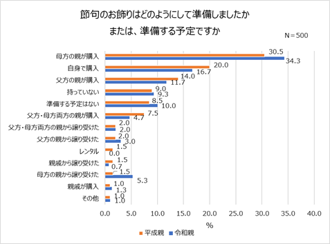 上記の調査から、節句のお祝いの仕方として「内飾り・外飾りを飾る」という回答が多く見られました。そこで、続いては「節句のお飾り」に注目。ひな人形や兜飾りなどの節句のお飾りはどのように準備したか、または準備する予定かを尋ねると、「母方の親が購入(平成親30.5%・令和親34.3%)」が最も多く、次点で「自身で購入(平成親20.0%・令和親16.7%)」、「父方の親が購入(平成親14.0%・令和親11.7%)」が多いことが分かりました。意外にも親子・親戚間で受け継ぐ層は少ないようです。