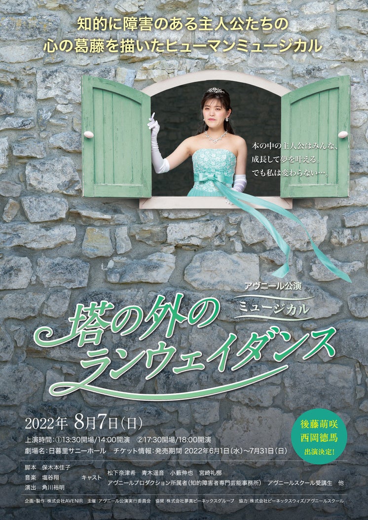 「塔の外のランウェイダンス」は日本で唯一、知的に障害のあるタレントを育成・マネージメントをしているアヴニールが世に投げかける作品です。各方面で活躍しているクリエイティブスタッフ、俳優が結集し、知的に障害のある主人公たちの苦悩の物語を、実際に障害のある俳優たちと作り上げた渾身のミュージカル作品です。