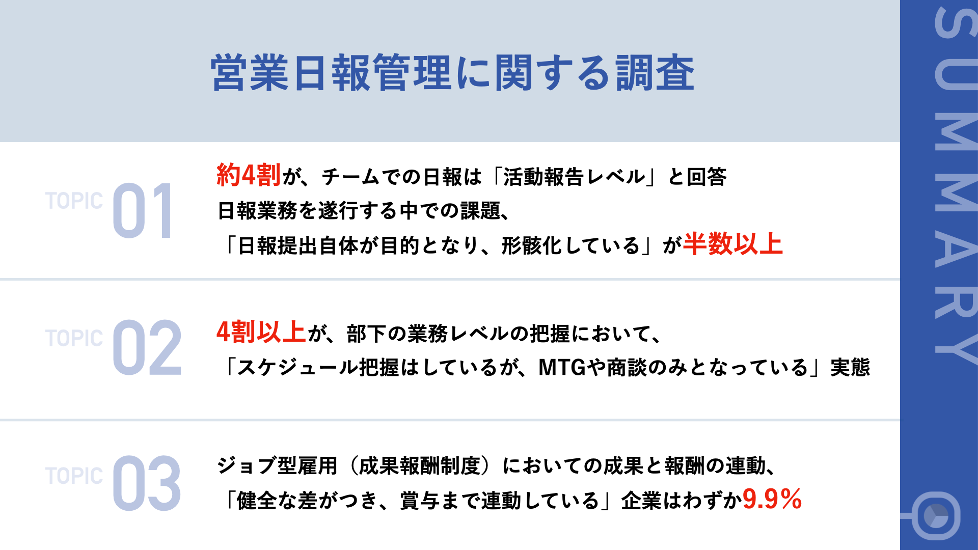 - マネジメントしているチームでの日報について、約4割が商談内容等の営業活動の報告などの「活動報告レベル」と回答
