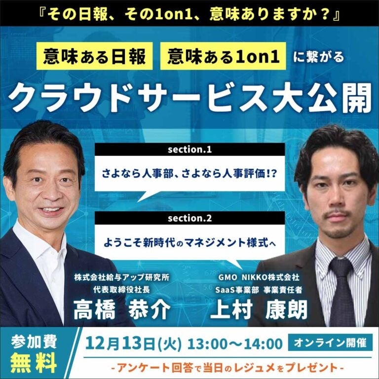 - 【12月13日(火)開催】『その日報、その1on1、意味ありますか?』 意味ある日報、意味ある1on1へ繋がるクラウドサービスを大公開!