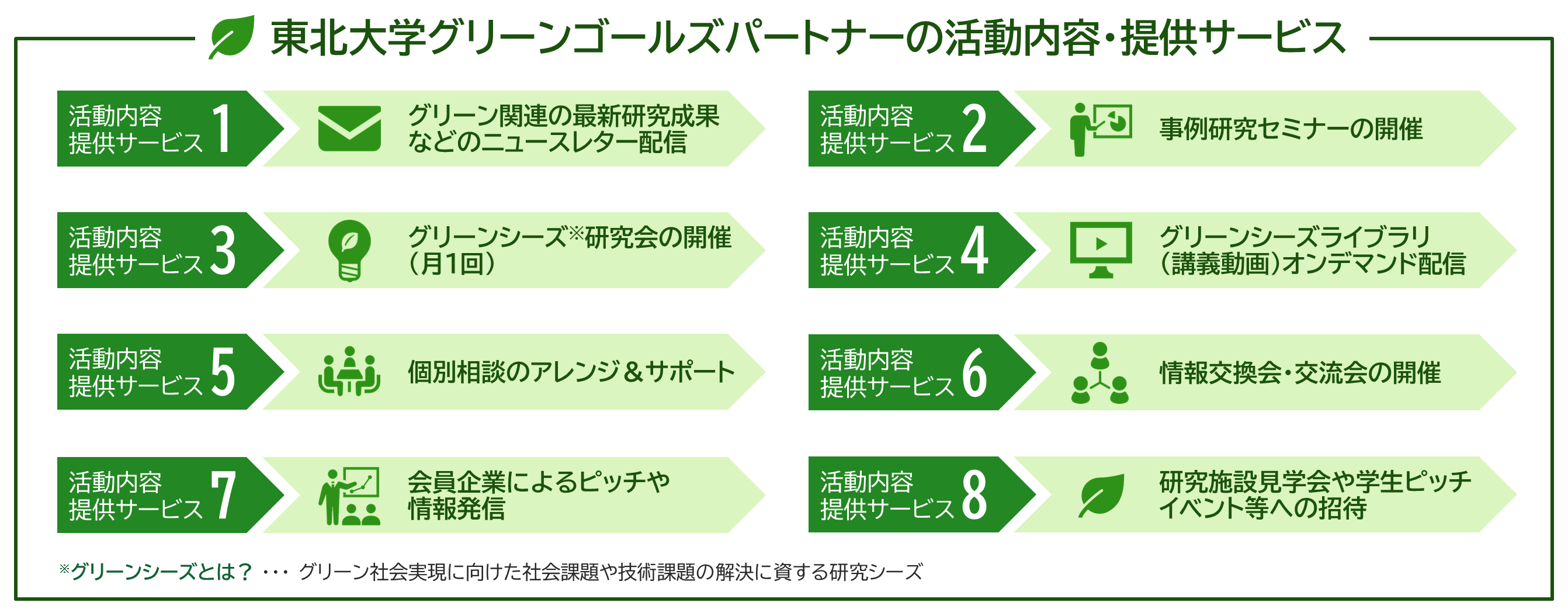 そこで、東北大学ナレッジキャスト株式会社は、東北大学グリーン未来創造機構の企画・監修のもと、グリーンイノベーションに貢献する東北大学のさまざまな研究成果を多くの企業と共有し、各企業が取り組む新事業創出や事業革新への活用を促進するために以下のような共創活動を展開してまいります。