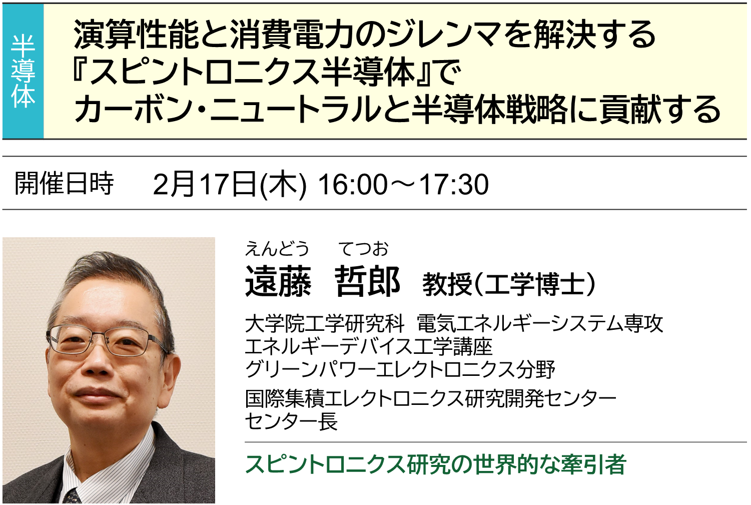 そのジレンマの解決に挑む世界的な半導体研究の牽引者である遠藤哲郎教授が、「消費電力1/100~1/1000を実現するスピントロニクス半導体技術」をテーマに日本の半導体戦略を担うキーテクノロジーを詳しく解説します。