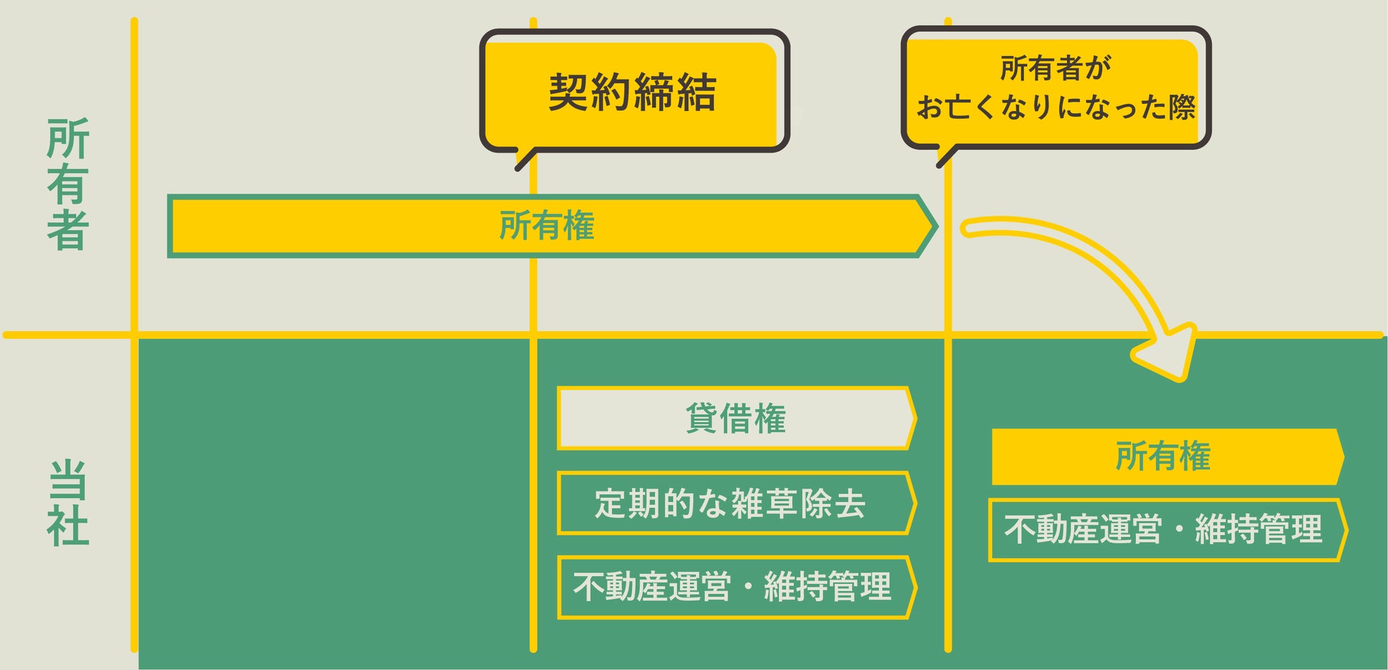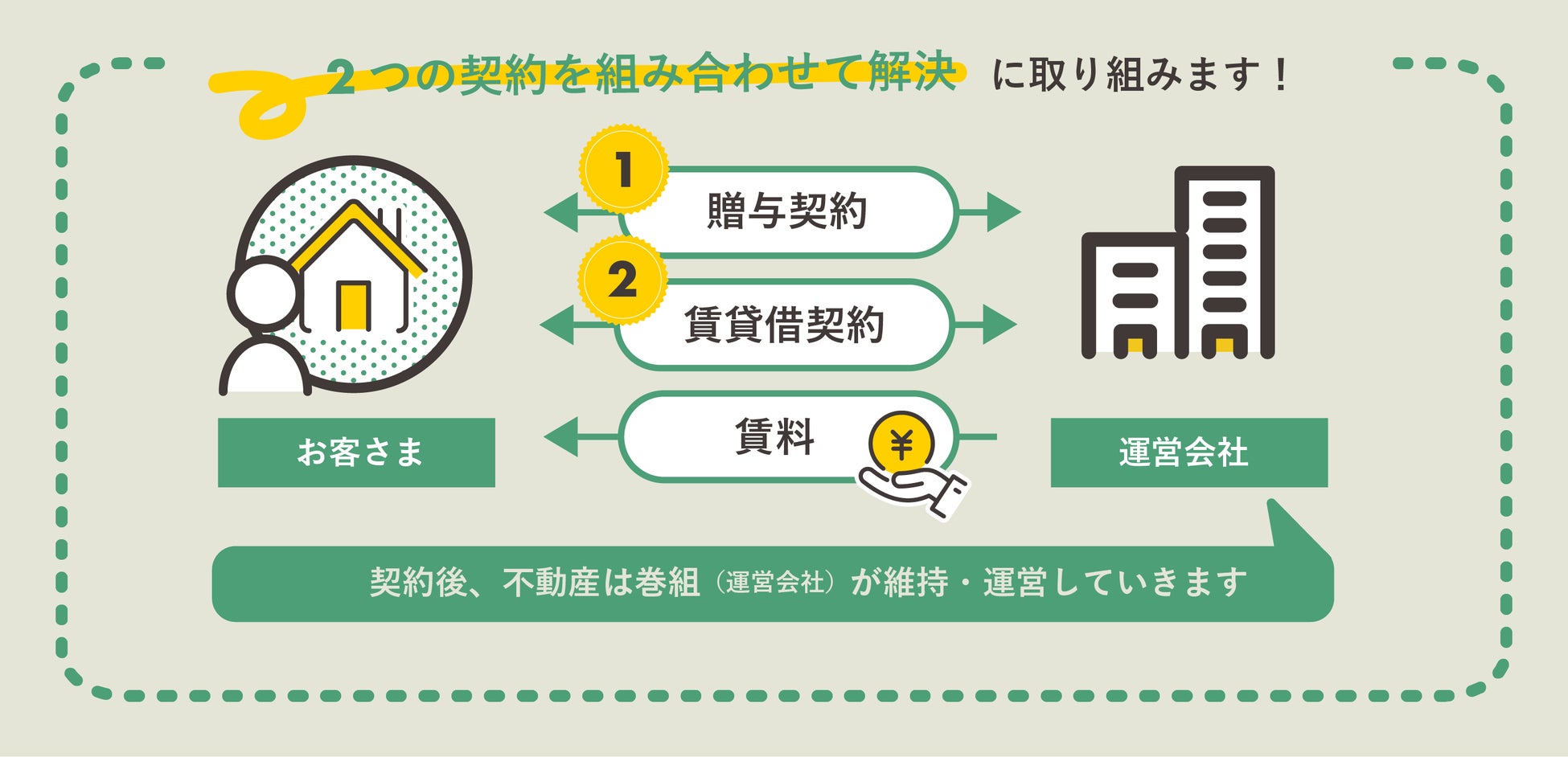 所有者が居住している物件でしたが、ご家族が遠方に住んでいるため、元気なうちに物件の引き取り先を明確にしたいという要望をお持ちでした。「始期付負担付死因贈与契約」と「停止条件付賃貸借契約」を締結。老人ホーム入居等により所有者の長期不在が確定した段階で賃貸借契約に移行し、巻組が建物の維持管理・運用を行います。所有権の移転は、所有者の死亡をもって死因贈与契約が執行された以降となりますが、この二つの契約を組み合わせることで所有者の長期不在が確定した段階から物件を空き家にすることなく、シームレスな運用が可能となります。