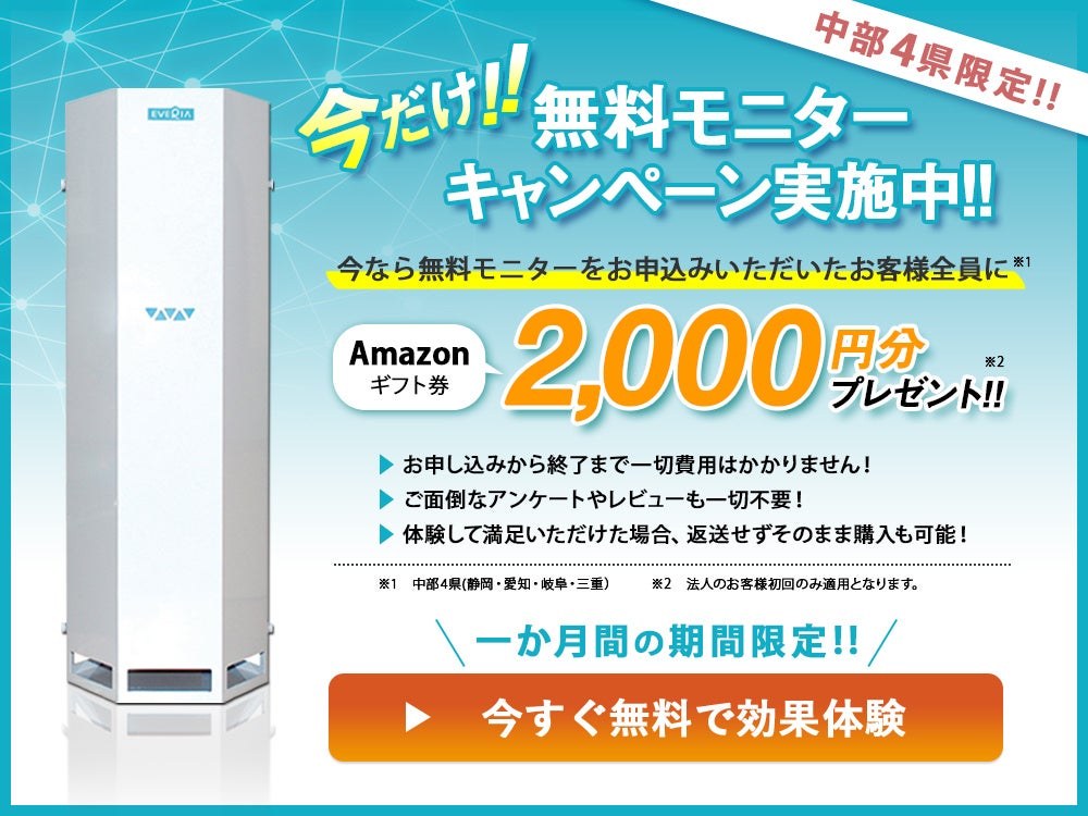 キャンペーン詳細:対象エリア内の法人様に限りまして、大空間対応UV式空間除菌エブリアを無料で1週間の体験ができるキャンペーンです。また、期間内にこちらのキャンペーンにお申込みをいただいた方全員にAmazonギフト券2,000円分を贈呈します。