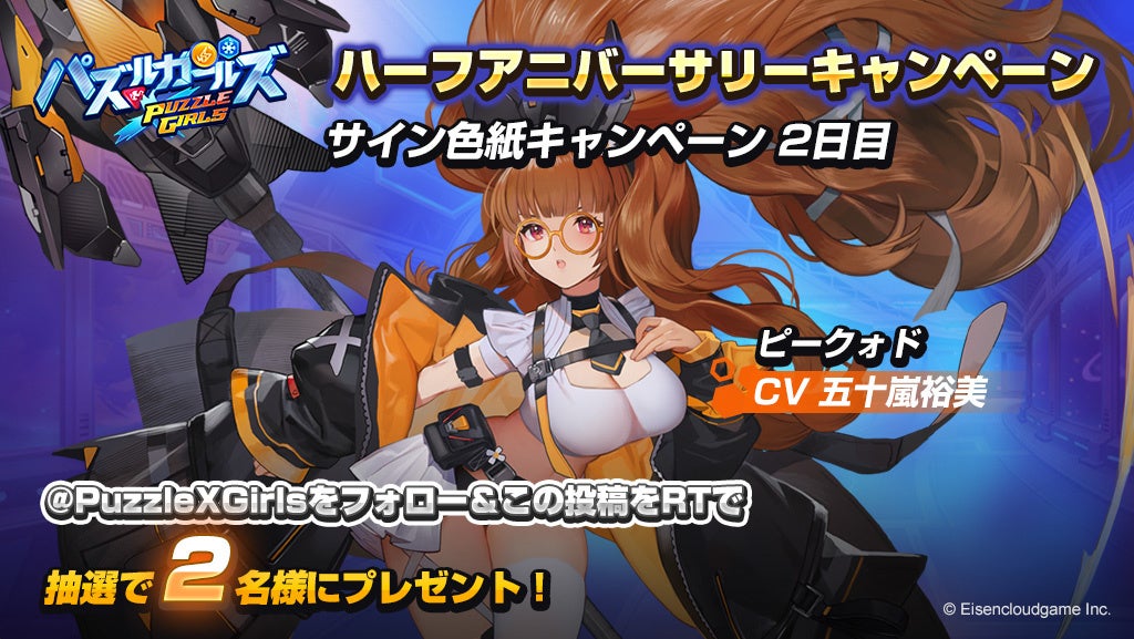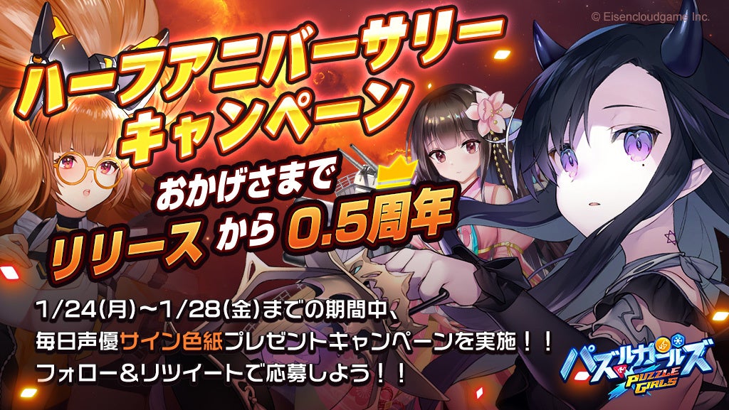 株式会社アイゼンクラウドゲーム(本社:東京都新宿区)は現在サービス中のスマートフォンアプリ、美少女パズルRPG『パズルガールズ』が2022年1月22日(土)にリリース0.5周年を迎えられたことを記念して、ハーフアニバーサリーキャンペーンを開催することをお知らせいたします。