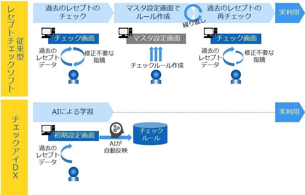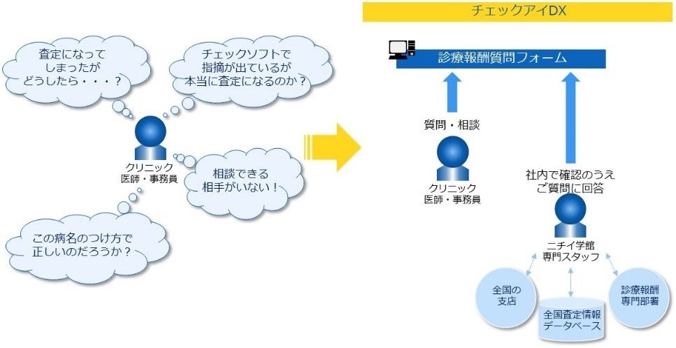 チェックアイDXは従来のレセプトチェックソフトで課題となっていた初期設定やメンテナンスを、AIとリアルタイム学習機能を活用することで解消し、誰もが簡単に使うことができる点が特徴です。また、診療報酬の解釈等に関する質問受付など、ユーザーに対して医療事務の専門会社であるニチイ学館がサポートを行います。