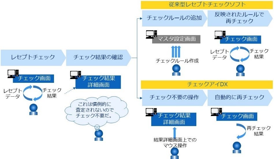 一方で、レセプトチェックソフト未導入の医療機関からはレセプトチェックソフトに対して、「初期設定が大変そうだし、使いこなせる自信がない」、「チェック結果を見てもどうしたら良いか分からない」、「電子カルテや医事コンピュータの簡易チェック機能と何が違うのか」といった声も多く寄せられています。このような声と、昨今の医療業界における人材不足の状況とを鑑み、より多くの医療機関でご活用いただけるように、クラウド型レセプトチェックソフト「チェックアイDX」をリリースすることになりました。