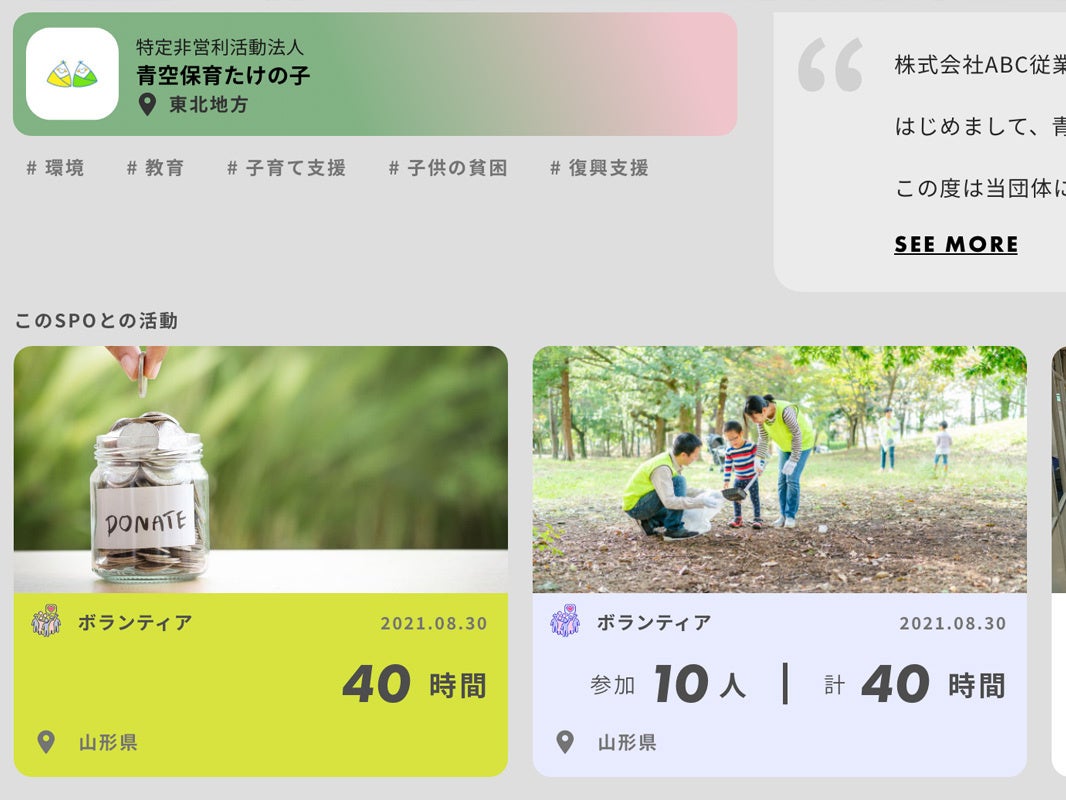 一緒に取り組みを行う連携先団体からの『アクティビティレポート』を通じて、自社のサステナビリティ活動によってどんな成果が生まれたかを多角的に伝えることができます。