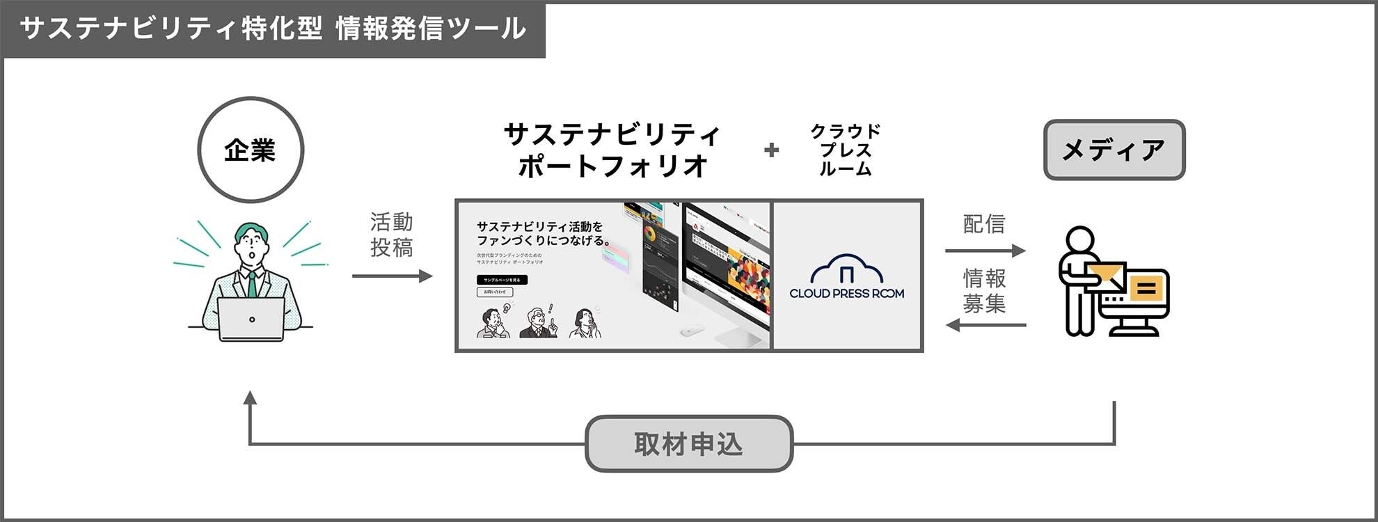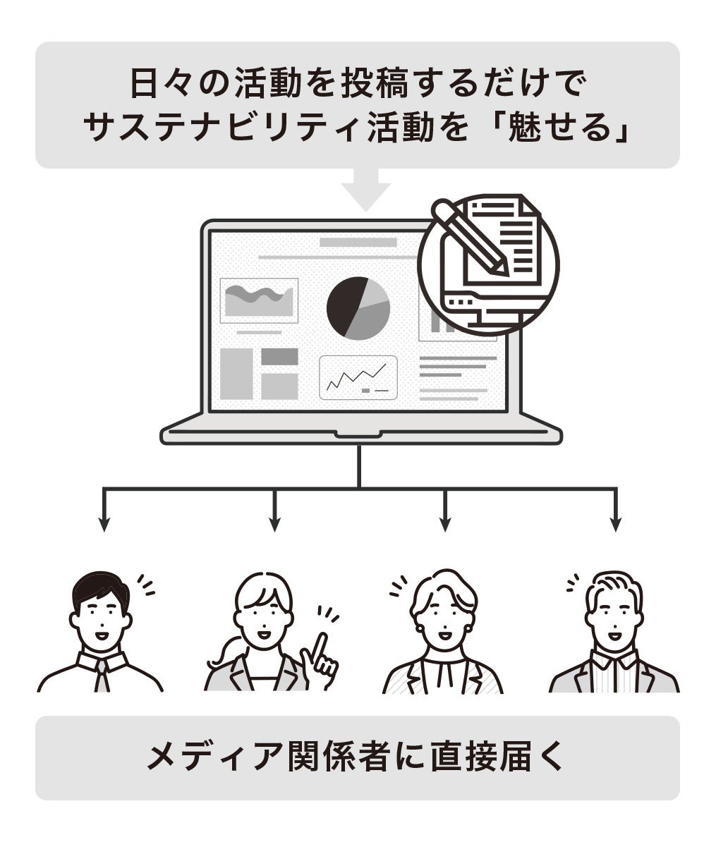 企業のサステナビリティ活動を一元的に見える化し、発信した活動内容がテレビ・全国紙・地方紙・マガジン等のメディア担当者に直接届くサービス。新規ファンの獲得や社内外ステークホルダーからの評価向上がねらい。