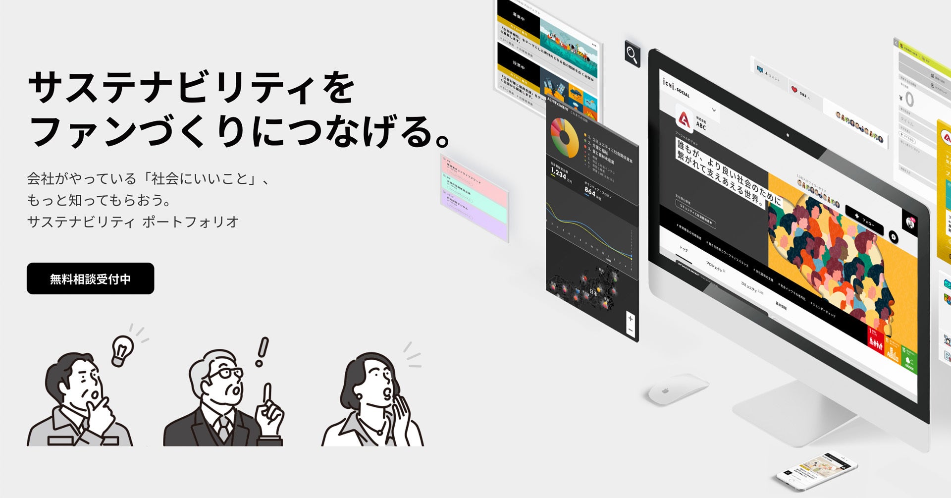 現在、企業様からの無料相談を受付中です。事業内容に合ったサステナビリティ活動のご提案をはじめ、当社が独自に持つ社会・市民セクターとのつながりを活かした協働機会のご提供といった、横断的なサポートも可能です。