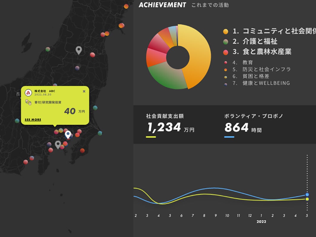 サステナビリティ活動への支出額や対象エリアなどは、自動でグラフや地図に反映されるため、情報が一元的に蓄積されていきます。