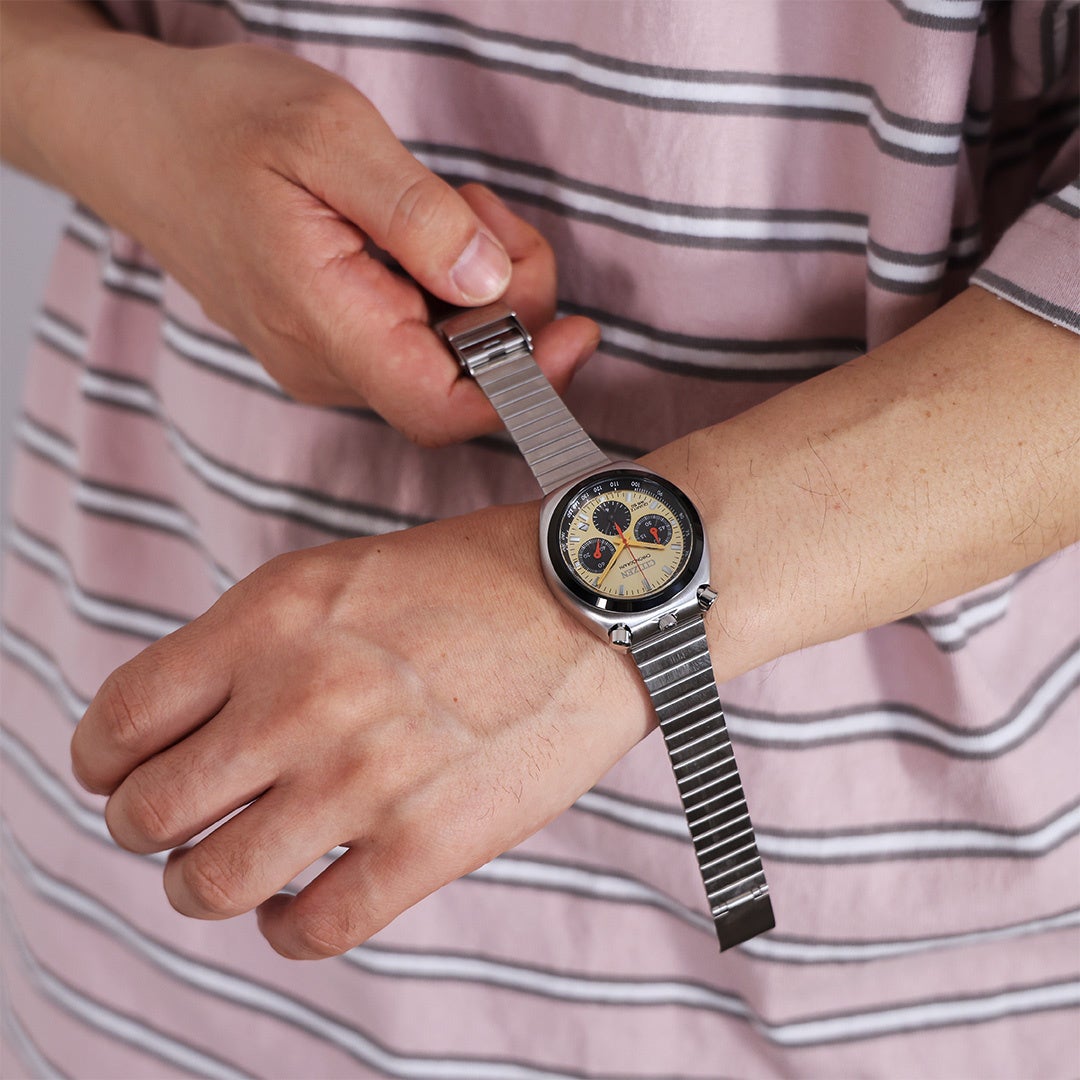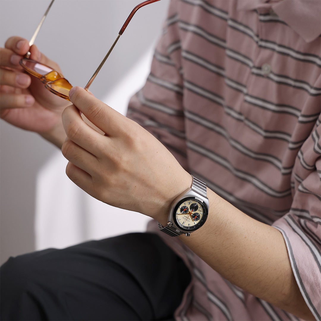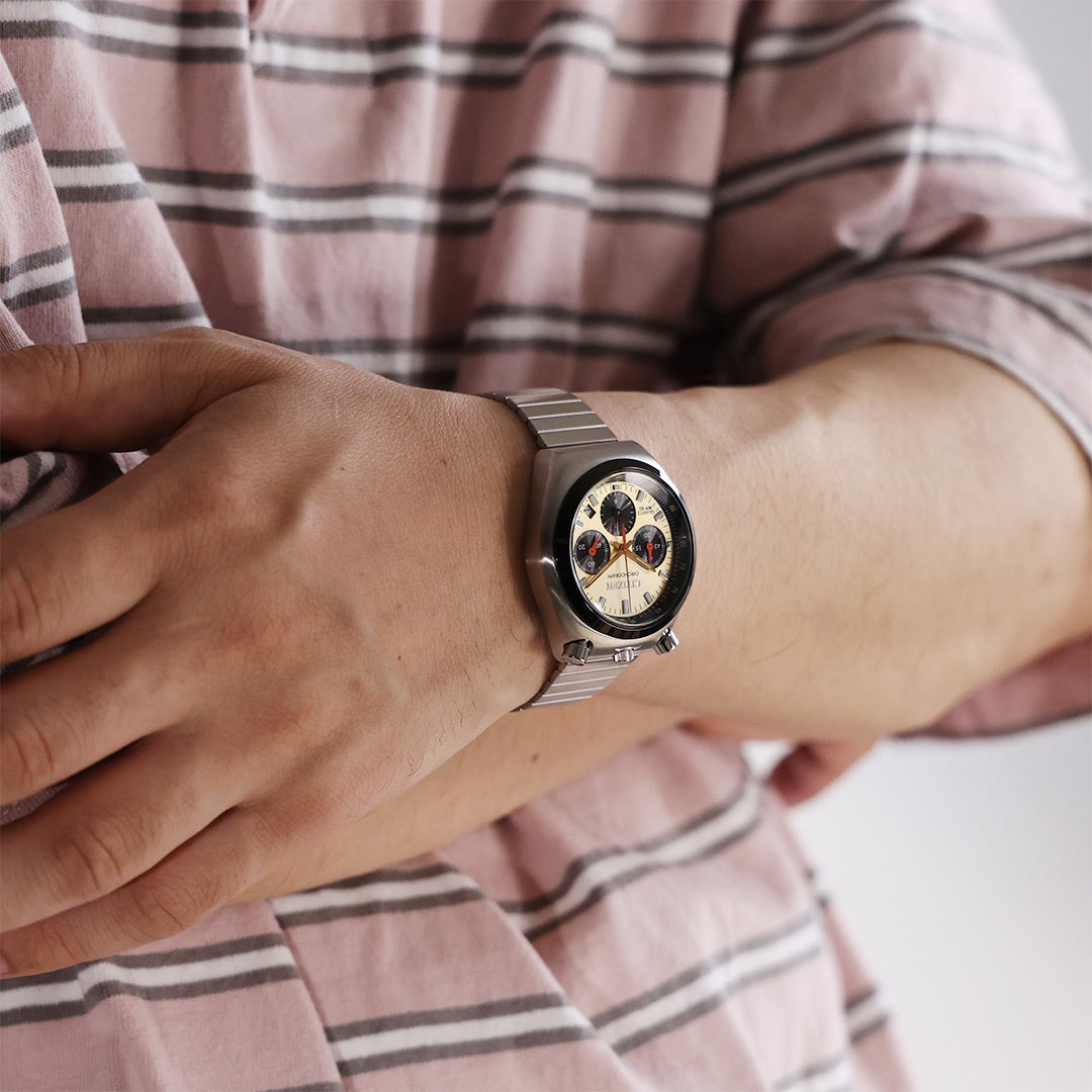 2021年に発売し、瞬く間に完売した別注グリーン文字盤。グリーンに続く第2弾をツノクロノ生誕50周年の節目に発売します!今回は1970年代当時に展開されていたゴールド文字板にインスパイアされた、名付けて「ゴールドパンダ」モデルを復刻。第1弾同様カラーリングにこだわり、派手になりすぎないやわらかい印象のシャンパンゴールドを採用し、ファッション的にも合わせやすい仕上がりになっています。