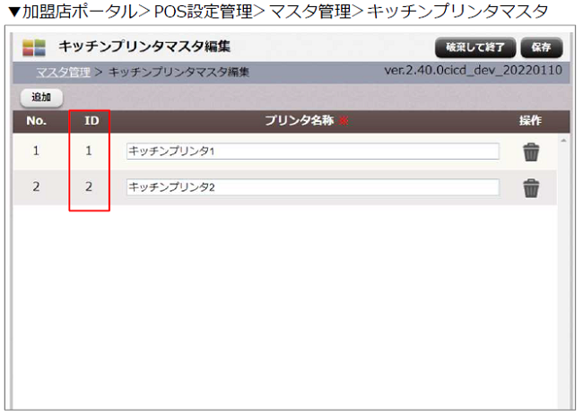 キッチンプリンタマスタメンテ画面上で、キッチンプリンタIDの確認ができる用になりました。