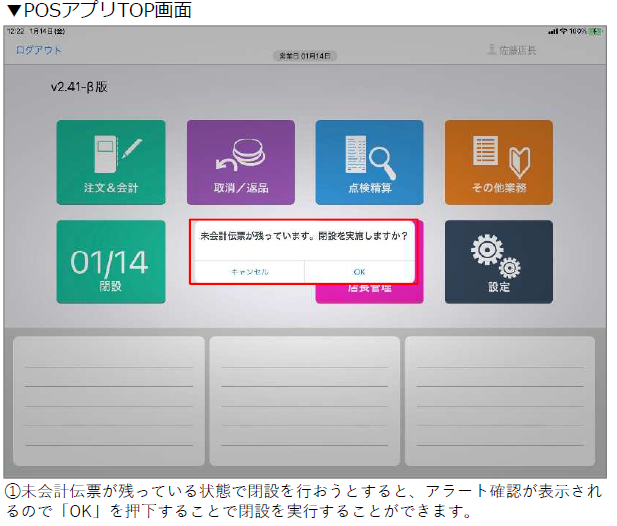 未会計伝票が残った状態でも閉設操作を行うことができるように対応しました。(翌日以降のテイクアウト注文伝票などを想定)