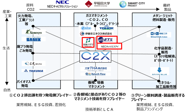 C2Xプロジェクトでは異業種連携、複数社のコラボレーションによる事業化に重点をおいた組織として「C2X」を機能させることで、再エネ導入による循環をベースとした持続的安心・安全かつ快適な脱炭素社会を実現することを目的とします。この度、新たに株式会社安藤・間(以下安藤・間)、株式会社ETSホールディングス(以下ETSホールディングス)、NECネッツエスアイ株式会社(以下NECネッツエスアイ)がC2X(Carbon to X)プロジェクトに参画することになりましたので、お知らせいたします。