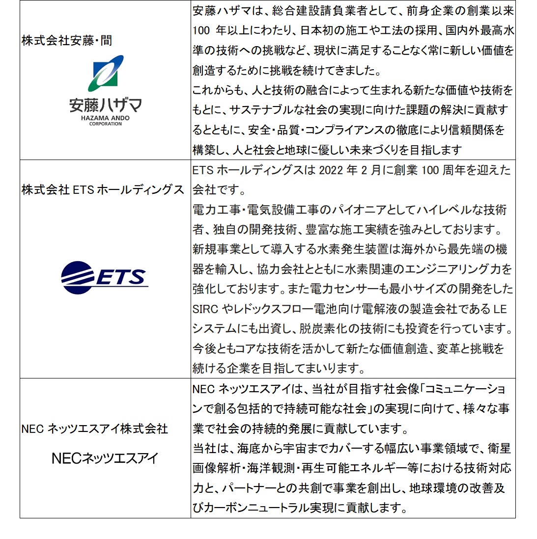 新たに参画した安藤・間、ETSホールディングス、NECネッツエスアイの有するこれまでの事業実績、技術、ネットワークとの相乗効果により、脱炭素社会を実現するための取り組みをますます加速していきます。