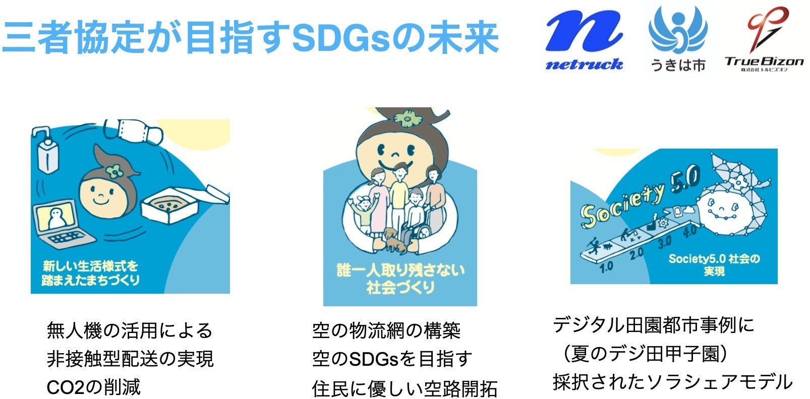 ソラシェアは、⾃治体⽀援を得ながら地域物流事業者と住⺠が「ドローン空路」を協働で構築することのできるシステムです。このムーブメントのことを我々は「空のまちづくり」と呼んでいますが、同モデルは内閣官房が実施した「夏のデジ⽥甲⼦園(全国のデジタル⽥園都市の好例を集めて評価したイベント)」にも採択されました。住⺠に⽀持されるドローン空路を構築することは、SDGsの観点からも⾮常に重要なことであると認識しています。ドローンは物流、災害調査、インフラ点検など、⽇本が抱えるさまざまな課題を解決すると⾔われていますが、その空路の利活⽤を持続可能なものにすべく、我々は地域とのコミュニケーションを重視した事業創出を⽬指しています。法改正後にはレベル4⾶⾏による、ドローン事業の拡⼤を狙うべく努⼒して参りますので、うきはの皆様の当事業に対するご理解とご⽀援を何卒、よろしくお願いします。