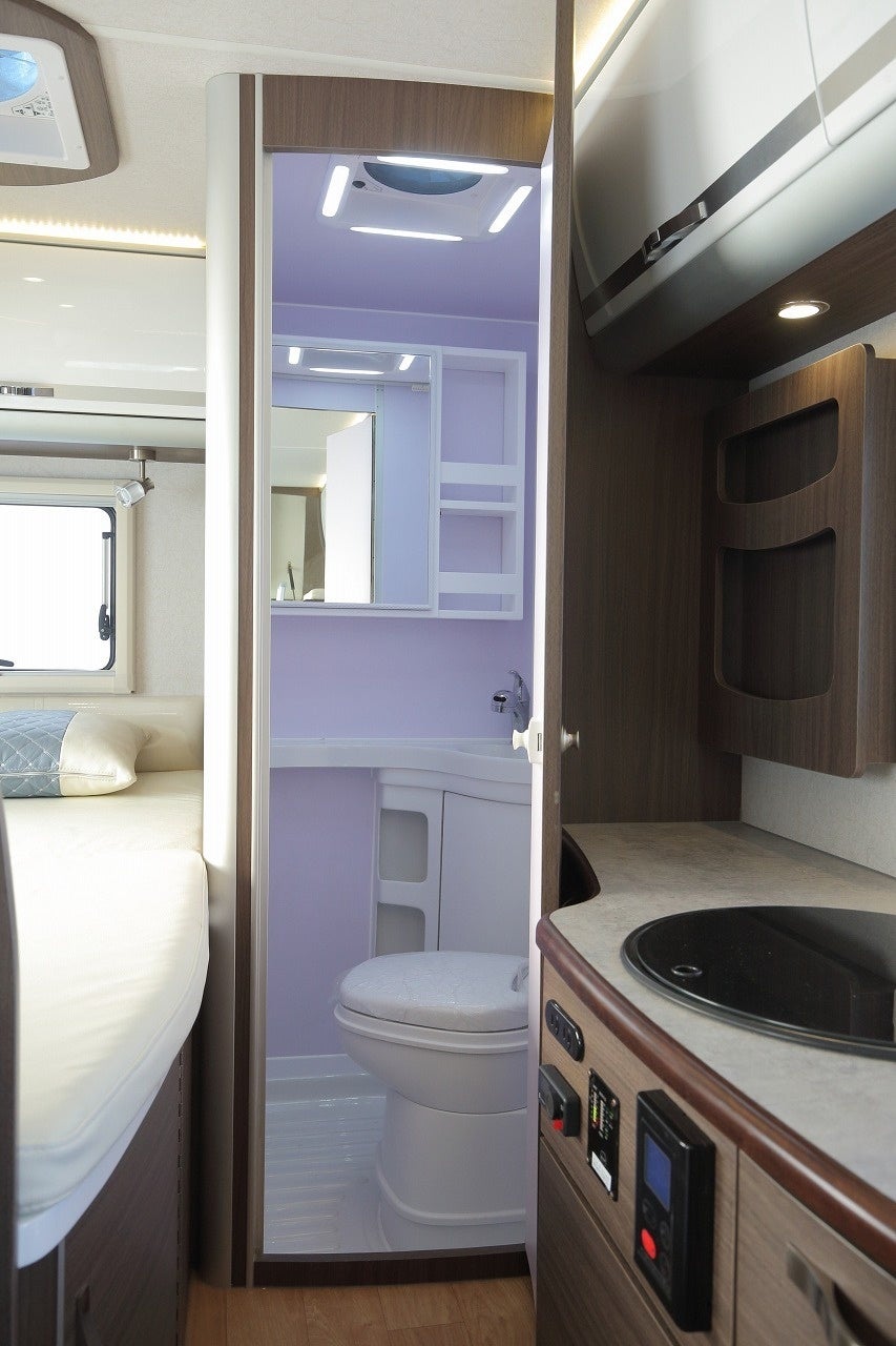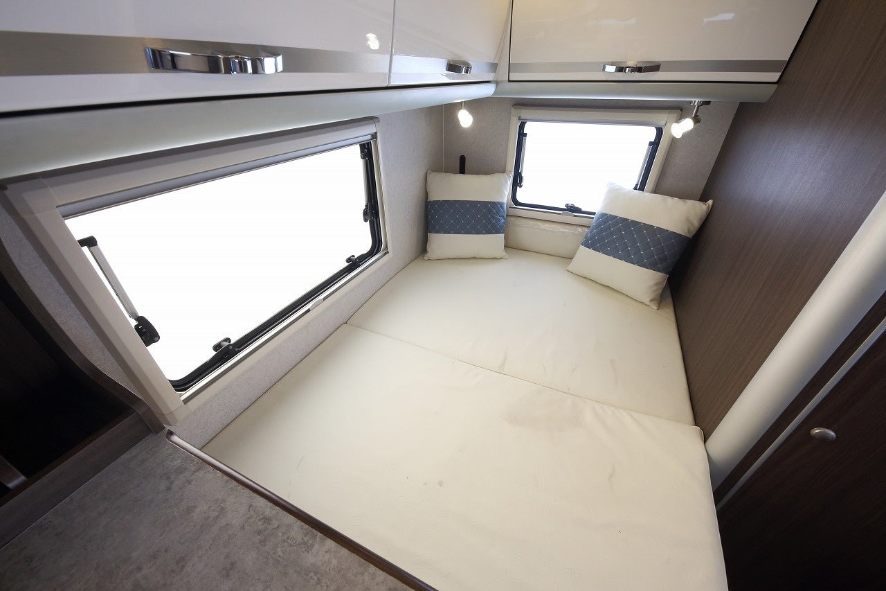 トイレ&シャワー設備がリア側に配置された特徴的なレイアウトで、常設ダブルベットが縦向きに配置されています。スペースを有効に利用できる効率的なレイアウトで、水回りの設備を左側に集中させ、車内でのスムーズな動線も確保しました。
