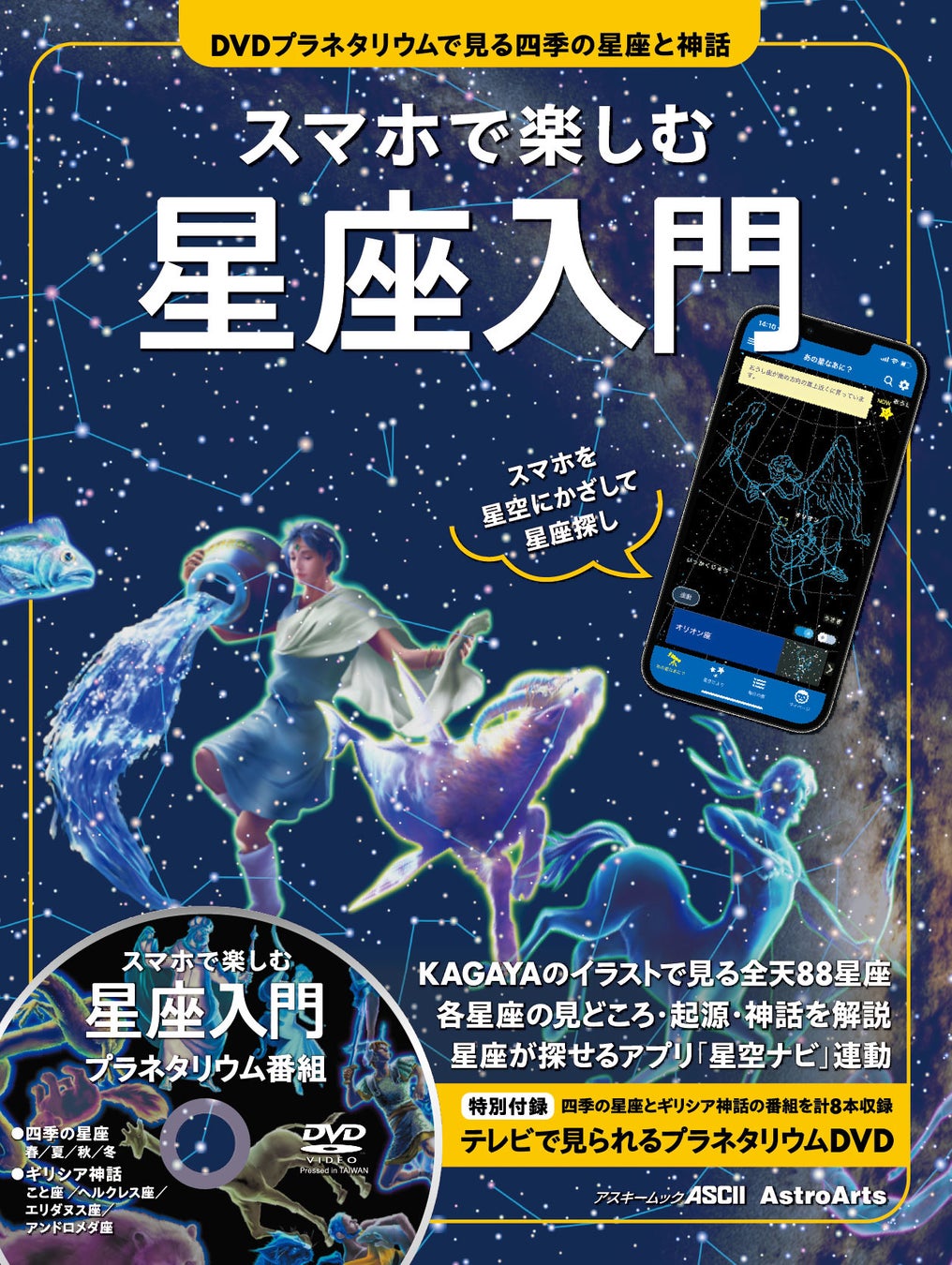 各星座が見える季節や方角、形や由来などの情報を網羅した紹介ページは内容を新たに見直し、デジタルアーティストKAGAYAの美麗なイラストとともにお楽しみいただけます。 さらに二次元コードをスマートフォンアプリ「星空ナビ」(iPhone/Android。基本無料)で読みとると、端末の方位センサーと連動して星座が実際に見える方向を矢印で教えてくれます。 付属DVDには、四季それぞれの星空の見どころや、星座にまつわる代表的なギリシア神話を紹介するプラネタリウム番組を収録しています。
