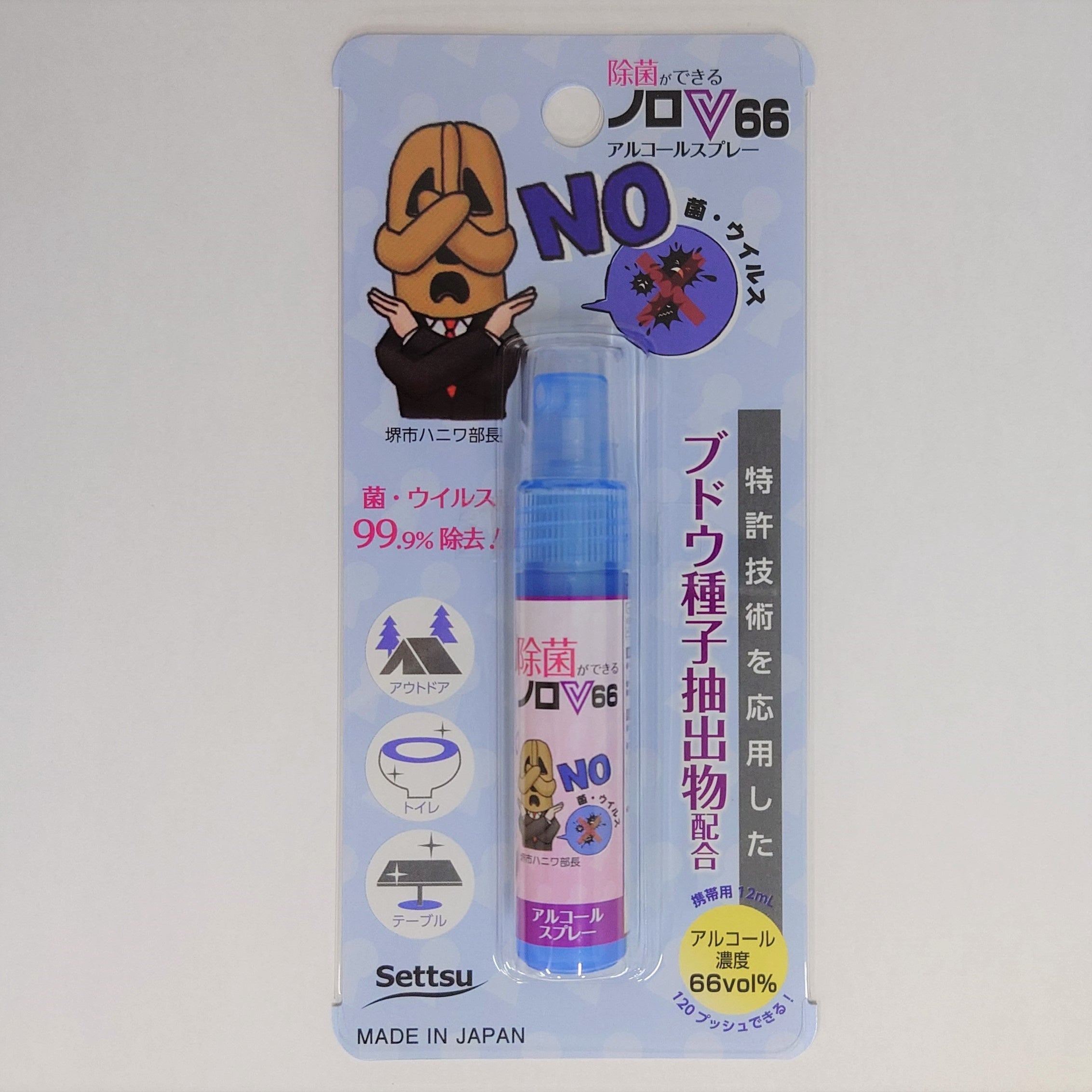 特許技術を応用したブドウ種子抽出物を配合した除菌・ウイルス除去剤「ノロVシリーズ」に、堺市ハニワ部長がデザインされた、お土産にもベストマッチな12mLの携帯用商品となります。
