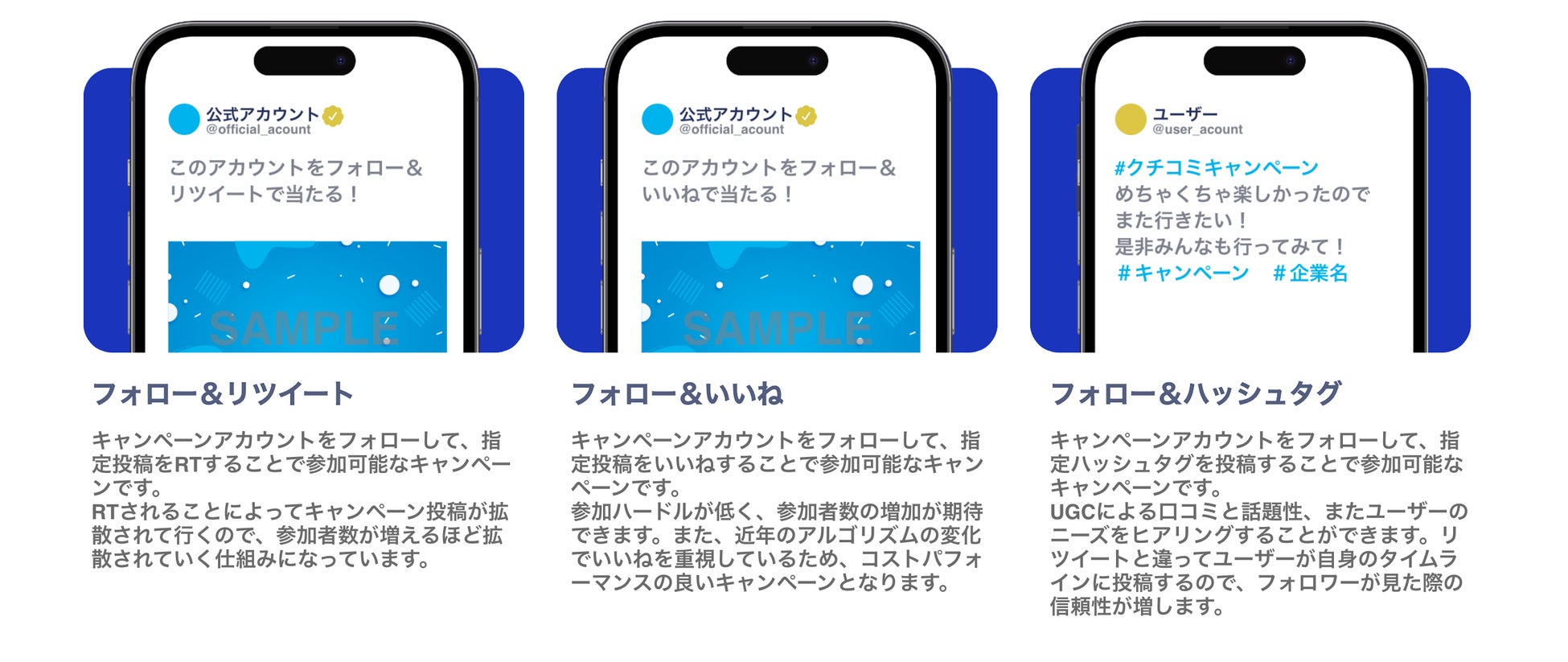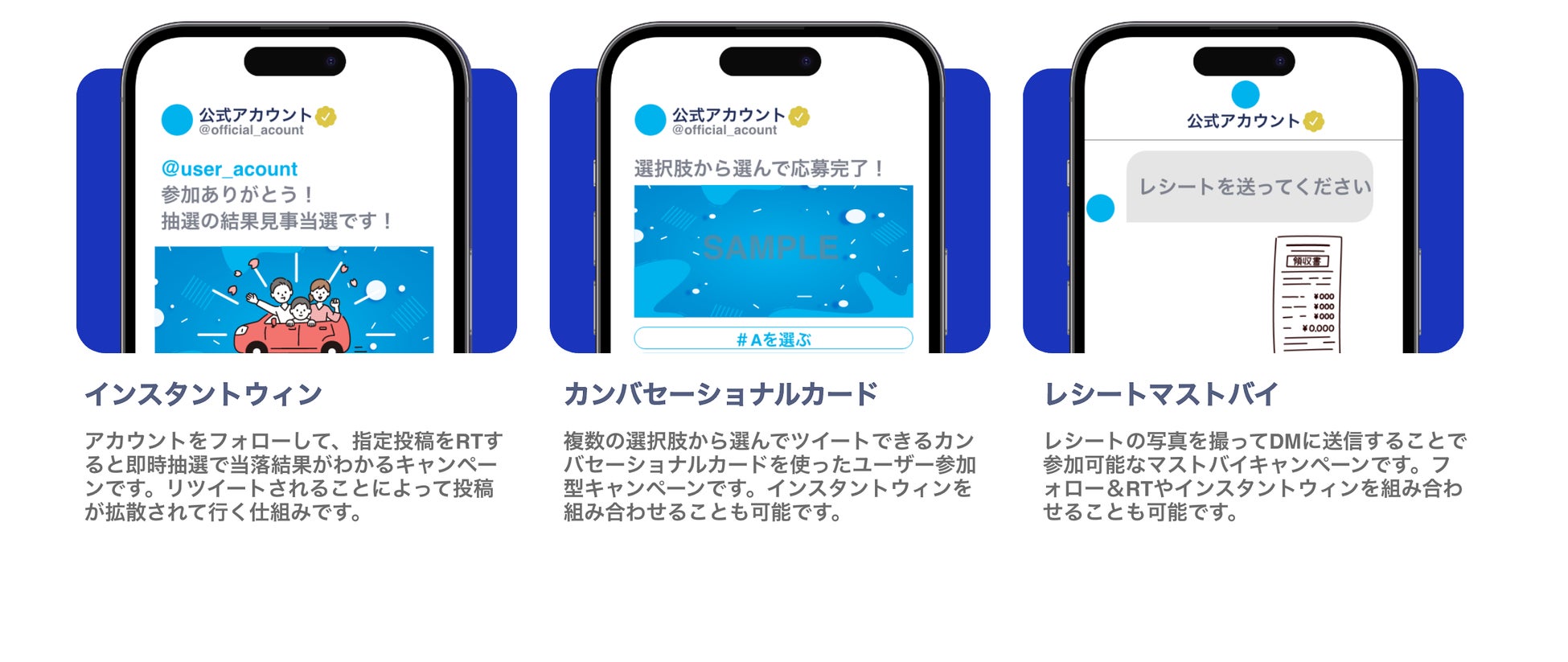 その場で抽選結果がわかるインスタントウィンや、複数の選択肢から選んでツイートができるカンバセーショナルカード、レシートを送って応募完了のマストバイキャンペーンなど複雑なキャンペーンも開催が可能です。