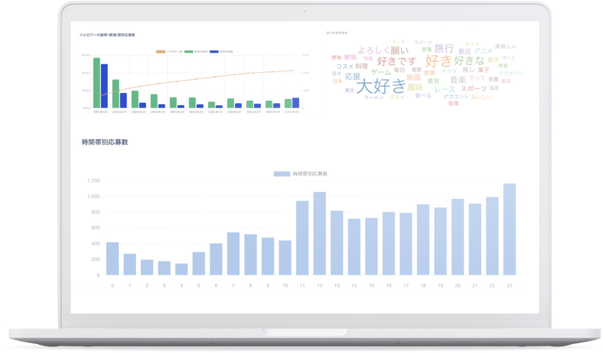 Twitterキャンペーン開催後の抽選やDM送信、分析までBirdCall内で全て対応できるので、このツールさえあればTwitter企業アカウント運用に必要な業務を完結することができます。