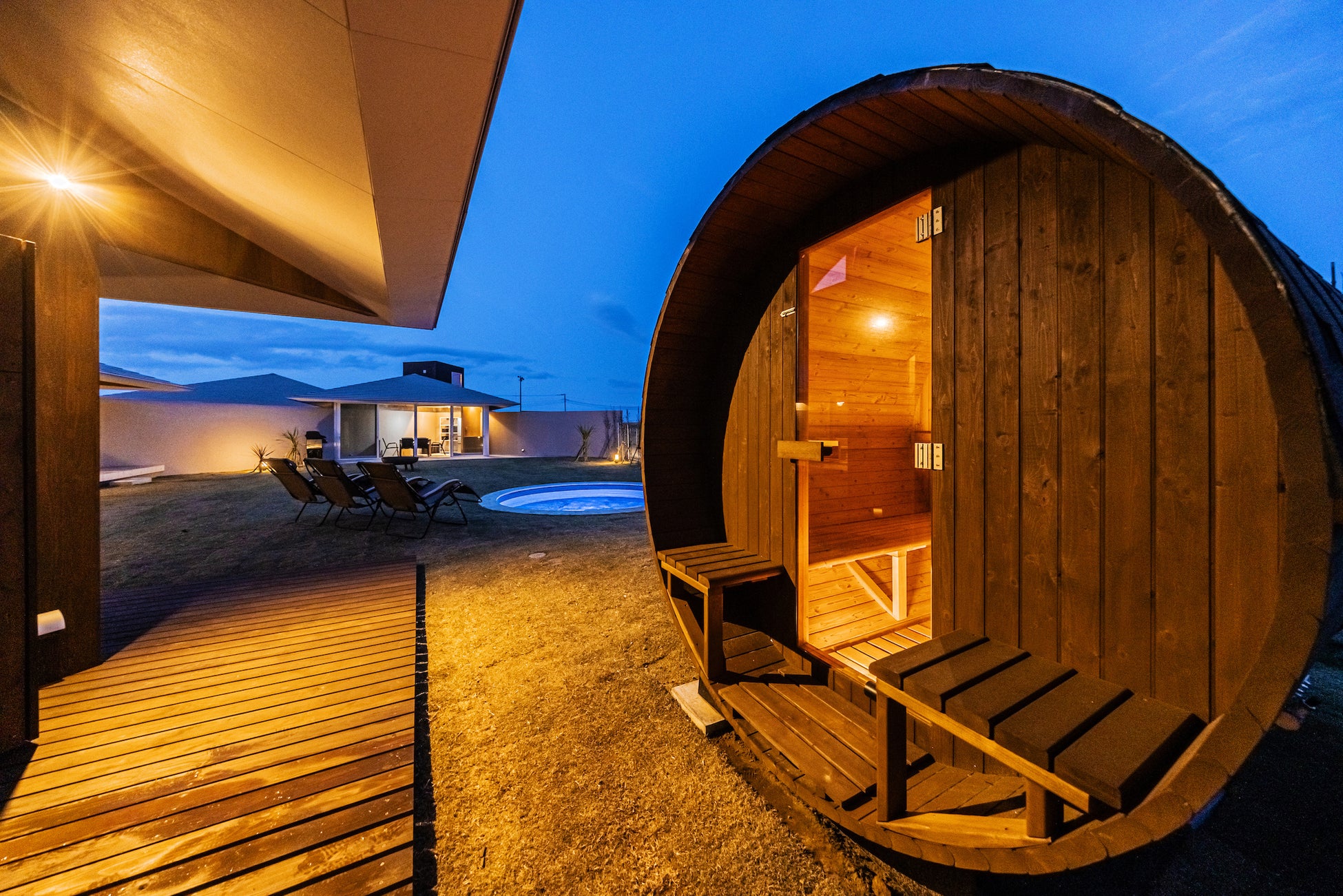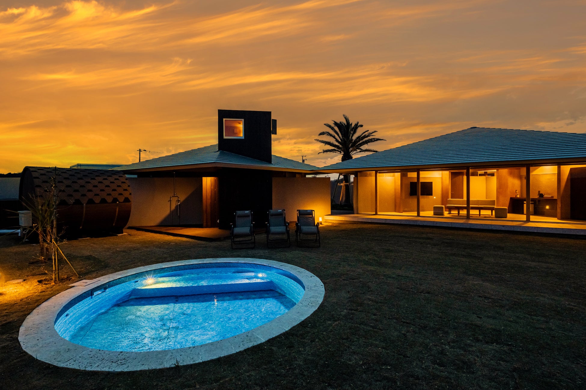 ドッグファーストな客室に配した、温泉、サウナ、プライベートプールでラグジュアリーな空間を演出。