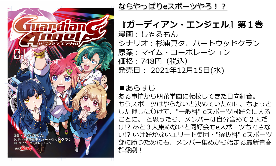 株式会社マイム・コーポレーション(本社:東京都台東区、代表取締役社長:岡田政夫)は2022年01月19日(水)、マンガBANGコミックスより「eスポーツ×女子高生」の部活青春ストーリーである『ガーディアン・エンジェル』が各電子書籍ストアにて電子単行本第一巻を発売したと発表しました。さらに『ガーディアン・エンジェル』の公式Twitterが開設しました。