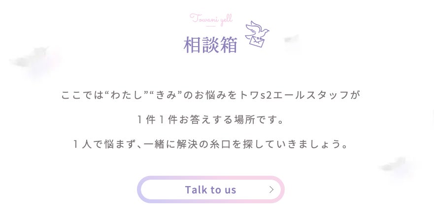 トワニエールは、これまでお子さまのお肌や身体のお悩みに寄り添い、商品を通じて3万人以上のお客さまにエールを届けてきました。商品は思春期ニキビ洗顔料やカルシウムサプリなど。ブランドコンセプトである『はばたき続けるすべての人へ永遠にエールを』の想いのもと、誰にも言えないお悩みを相談できる匿名のメールサービス『相談箱』を実施するなど、子どもたちが健やかに成長し、未来に向かって羽ばたける社会を目指してサービスを提供しています。
