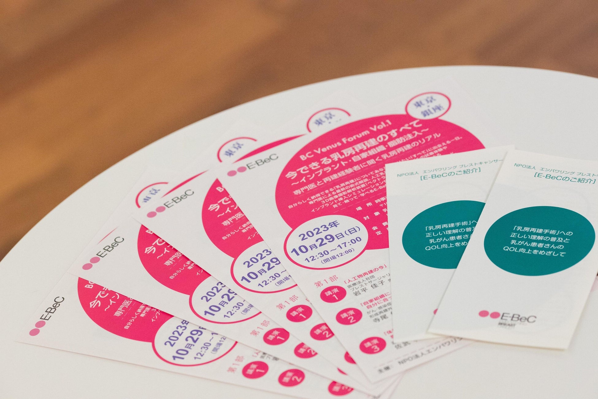 E-BeCは、乳がんと宣告され混乱の渦中にいる方や手術によって乳房を失い喪失感にとらわれている方に、乳房を取り戻す「乳房再建手術」について正しく知ってもらい、希望と自信をもって生きていくきっかけを提供することを目指して活動している患者支援団体です。