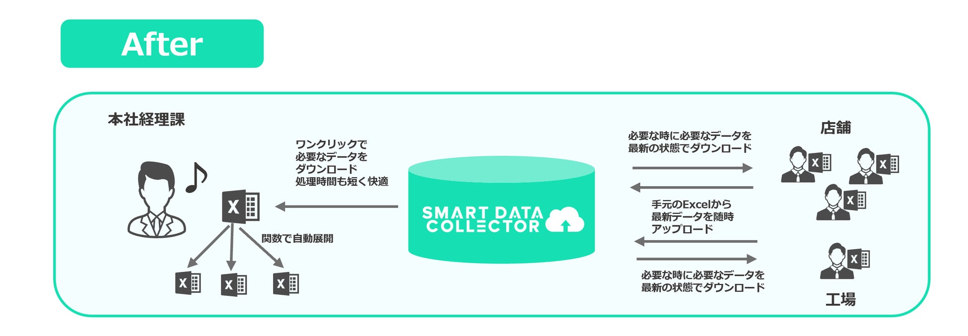 スマコレにデータを蓄積・最新化することで、各担当者が「自分で」「必要な時に」「必要なデータを」手元のExcelに取り出せるようになり、アイドルタイムとストレスを大幅に軽減することができました。