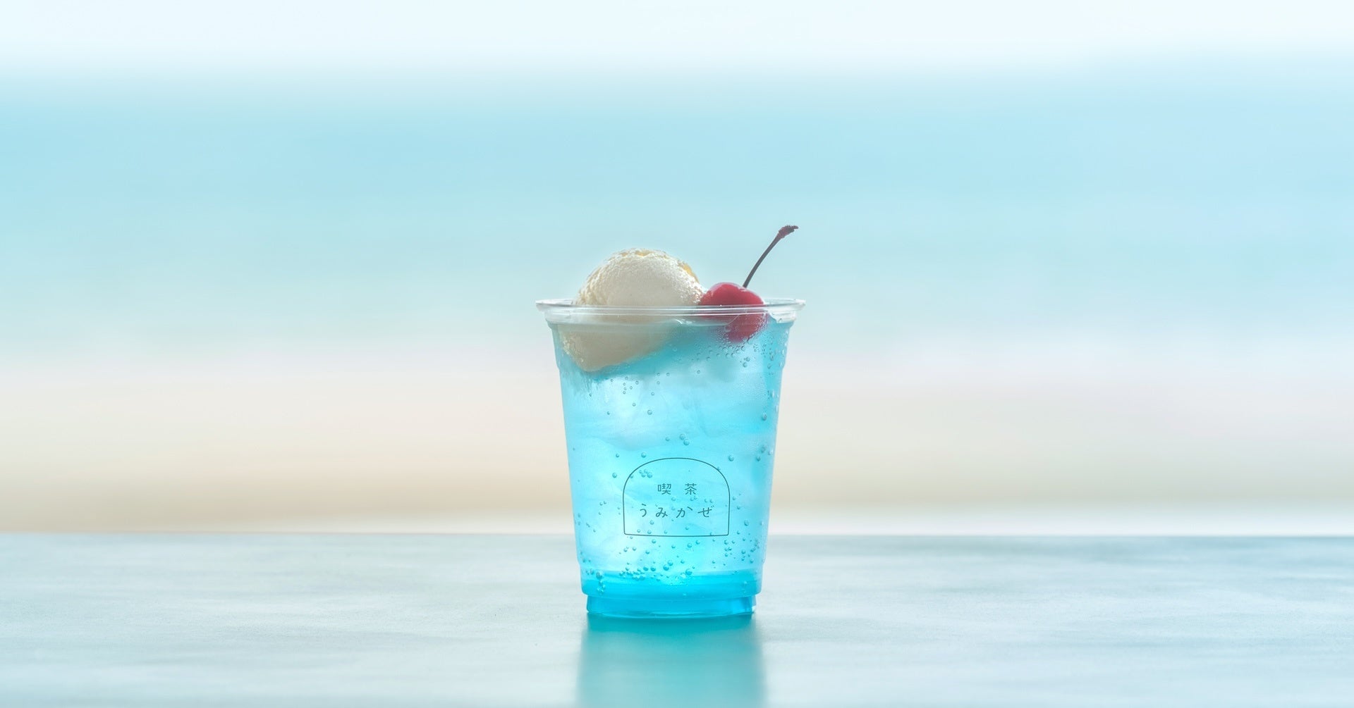 喫茶うみかぜの前に広がる美しい海と空をイメージした、透き通る青色のクリームソーダ。ライチのさっぱりとした甘さとバニラアイスが溶け合う、海辺で飲むのにぴったりなドリンクです。