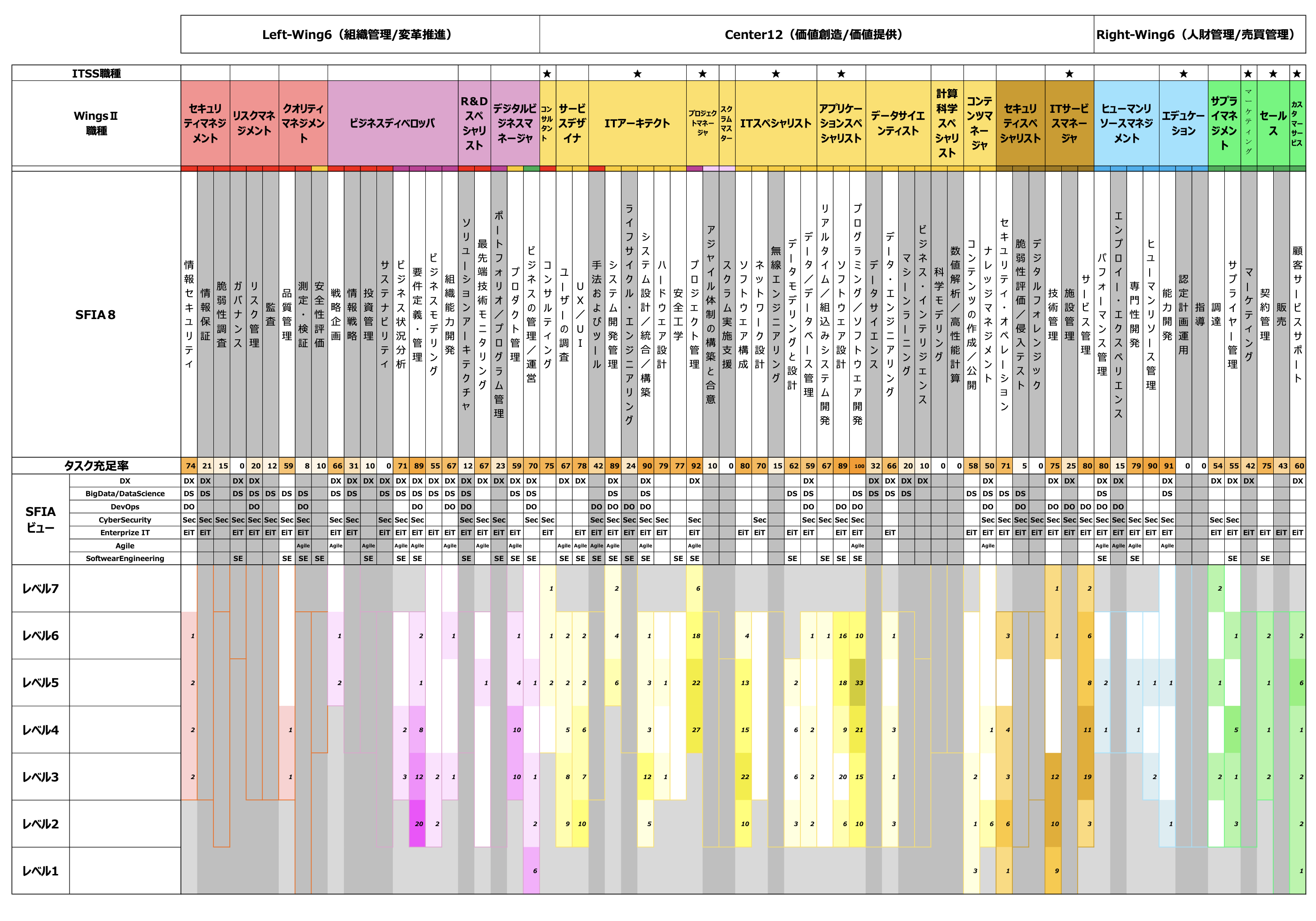 ① 自社分析 自社のiCD診断データをWingsフレームワークにマッピングし、最新のグロー バルな職種/専門分野を鳥瞰した視点にて、自社の位置づけを把握可能とする。