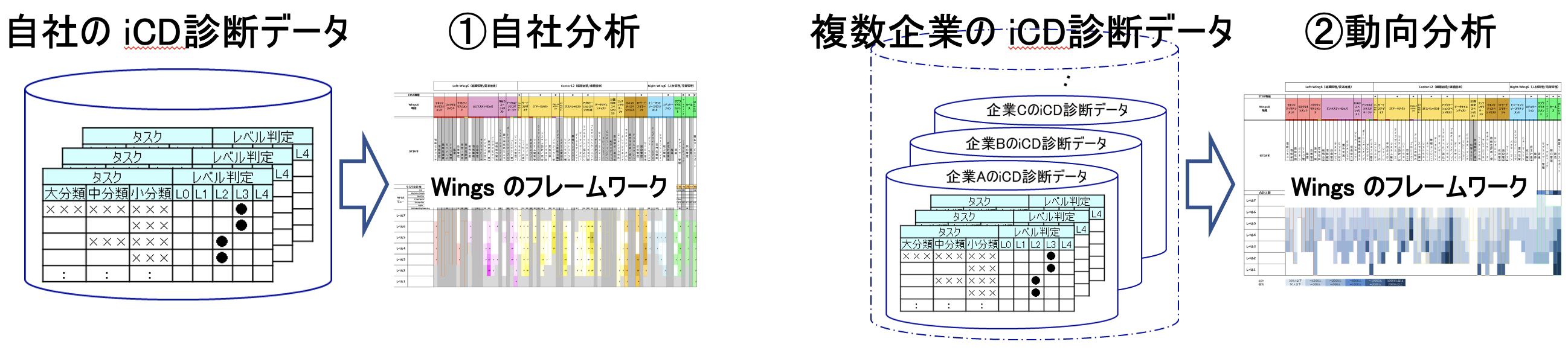 ② 動向分析 当該サービスに賛同された複数企業のiCD診断データをWingsフレームワー クにマッピングして、その全体傾向の把握を可能とする。